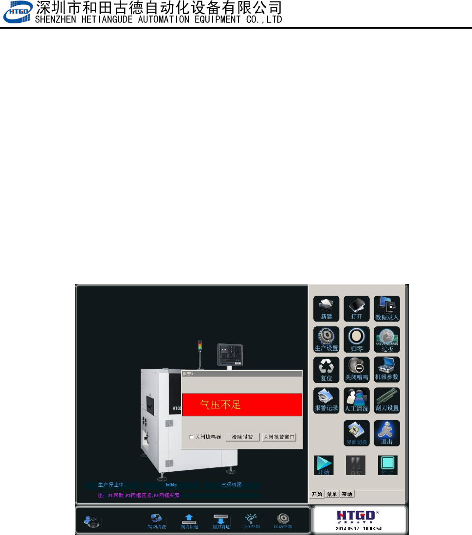 - 39 - 第五章 报警处置 第五章 报警处置 5.1 机器报警项目 1 气压不足报警 2 紧急按钮按下时报警 3 清洗装置不在原点报警 4 伺服马达驱动器报警 5 门开关警示 6 清洗纸已经用完警示 7 清洗液用完警示 8 运输超时,请按复位键警示。 5.2 报警项目解释及处置方法 1 气压不足报警,当压缩空 气的压力达不到我们设置的最低值或者超出 最高值时,软件 会弹出报警对话框,同时三色灯显示红色,蜂鸣器呜呜作响。如图 5-1 …