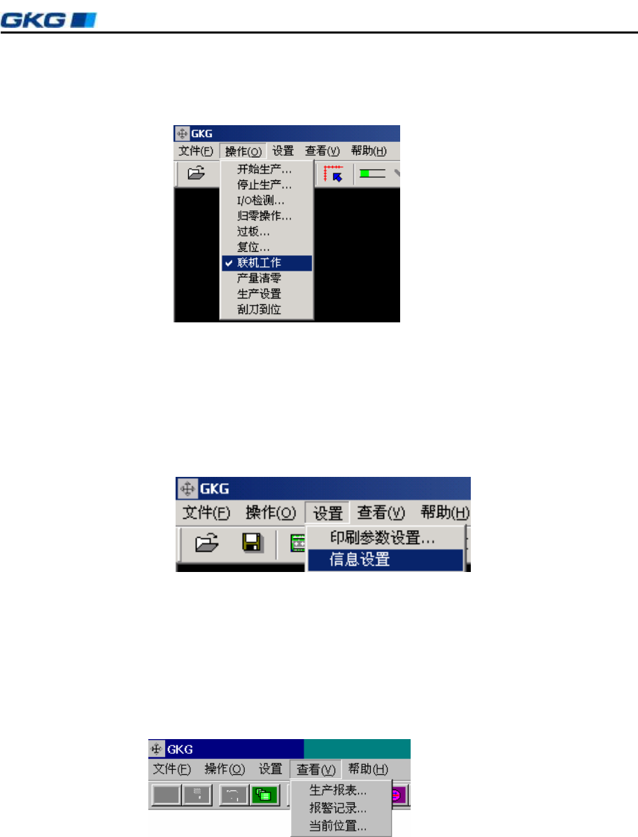 凯格 精 密机械有限公司 - 19 - 第 四 章 操作系统 说明 单 击 主菜单 中 的 [ 操作 ] ,出 现 下 拉 菜单 , 可 以 进行 [ 开始生产 ] 、 [ 停止 生产 ] 、 [ I /O 检 测 ] 、 [ 归 零操作 ] 、 [ 过 板 ] 、 [ 复 位 ] 、 [ 联 机工作 ] 、 [ 产 量 清 零 ] 、 [ 生产 设置 ] 、 [ 刮刀 到 位 ] 等 项 操作 , 如 图 4 – 5 所 示 。 图 …
