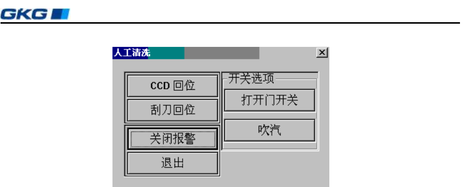 凯格 精 密机械有限公司 - 25 - 第 四 章 操作系统 说明 对 话 框 , 如 图 4 – 16 所 示 , 等 待 人 工 清洗网 板 , 步 骤 如 下 : 图 4- 1 6 〈 人 工 清洗 〉 对 话 框 Ø 在 “人 工 清洗 ” 对 话 框 中 单 击 “ 打 开 门 开 关 ” 按 钮 , 将 机 器 前 罩 门 打 开 , 并 单 击 “ C CD 回 位 ” 按 钮 ,使 CCD 部分 回 到 原 点 位置 。…