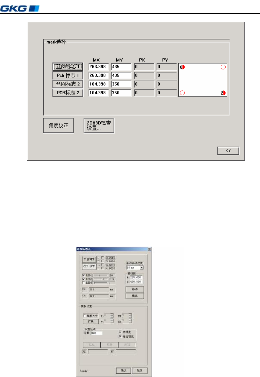 凯格 精 密机械有限公司 - 27 - 第 四 章 操 作 系统 说明 图 4-1 8 < 标志点 采 集 > 对 话 框 对 话 框 进入 方 式 : [ 数 据录入 ] + [ 密 码 输 入 ]+[ 参 数设置 1] +[ 参数设置 2] + [PCB 定位 ]+ [ P CB 标志 点 采 集 3 . 在 [ 标 志点 采 集 ] 对 话 框 中 , 通 过 调 用 图 像 处 理 功能及 标 志点 位 置 选择的 …