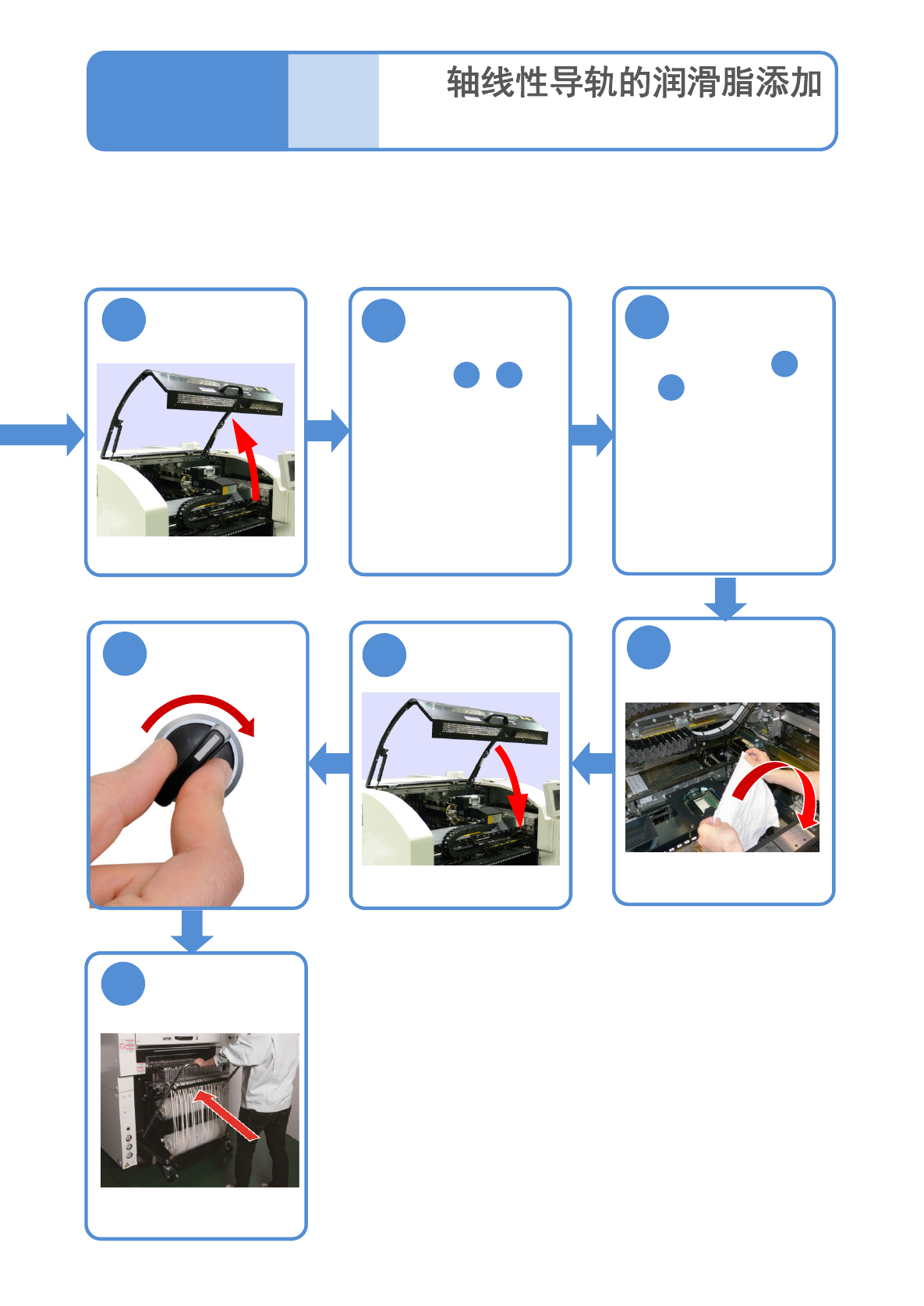 NPM-W2 EJM7DC-MB-06M-05 6-2 -7 XY 4 维修保养篇 6 - 2 擦去由于长期使用 而溢出的润滑脂 ●参阅顺序 。 ●确认线性导轨或润滑脂注 入口是否有液体状润滑脂, 需要定期擦拭。 安装交换台车 ( → P.3-2) 10 1 1 34 SERVO ON 36 ( 前侧、后侧 ) ( 前侧、后侧 ) 30 31 35 32 ●实施三次步骤 到 。 12 31 33 取下棉纱布