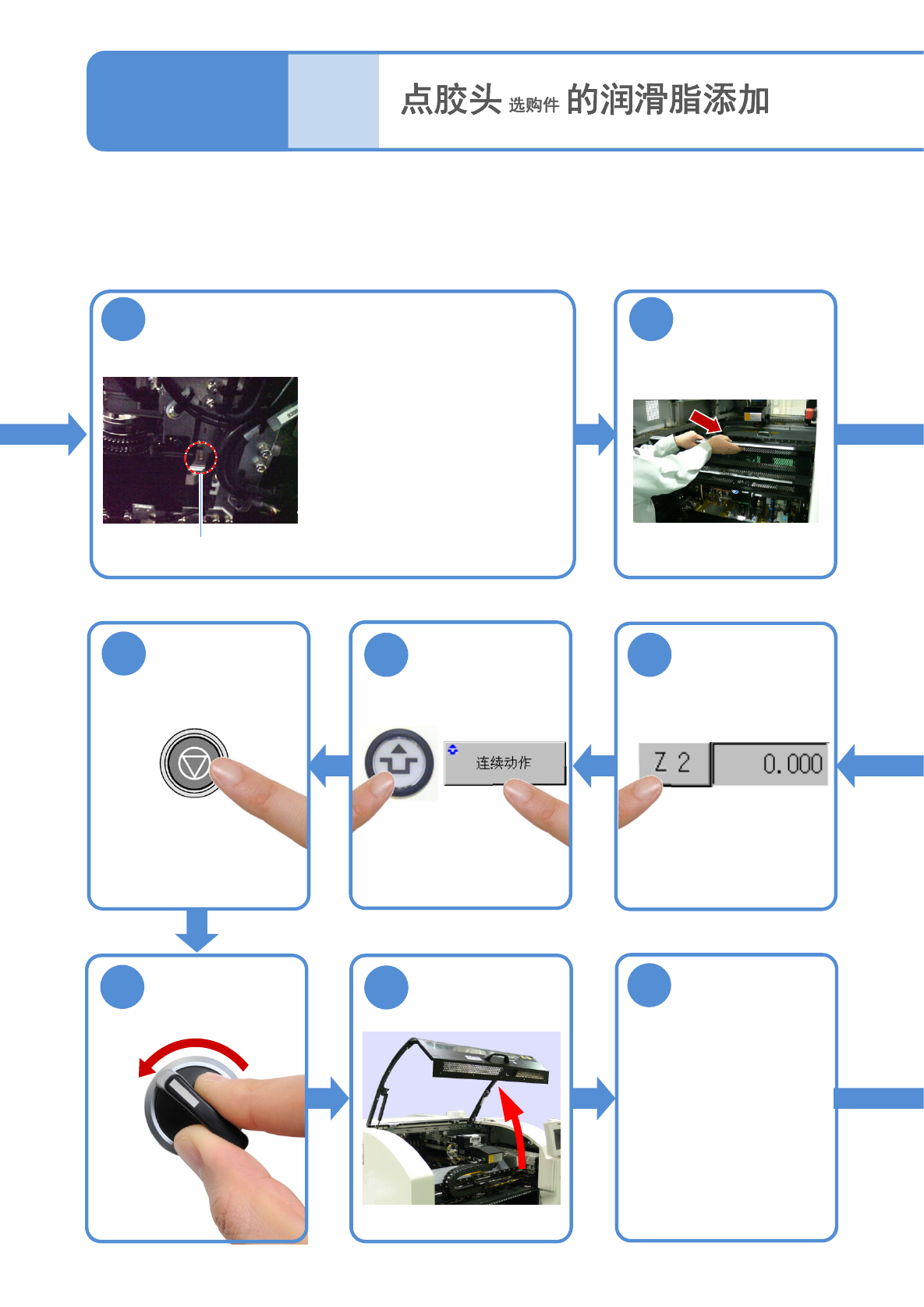 NPM-W2 EJM7DC-MB-06M-05 ACTIVATION 8 ●工作前,请卸下点胶器部分。 ( → P.4-2 -5) 顺序 每 5 6 0 小 时 保 养 定 期 检 查 6-19 -2 ●用干净的纱布擦去黏在滚 珠丝杠,线性导轨上旧的 润滑脂。 擦去旧的润滑脂 ●分别在 pos.1 、 p os.2 的各 轴,各 1 处进行供给。 ●润滑脂量:各添加 0.3 cm 3 ●使用润滑脂: LCG10 0 4 1 OFF SE…