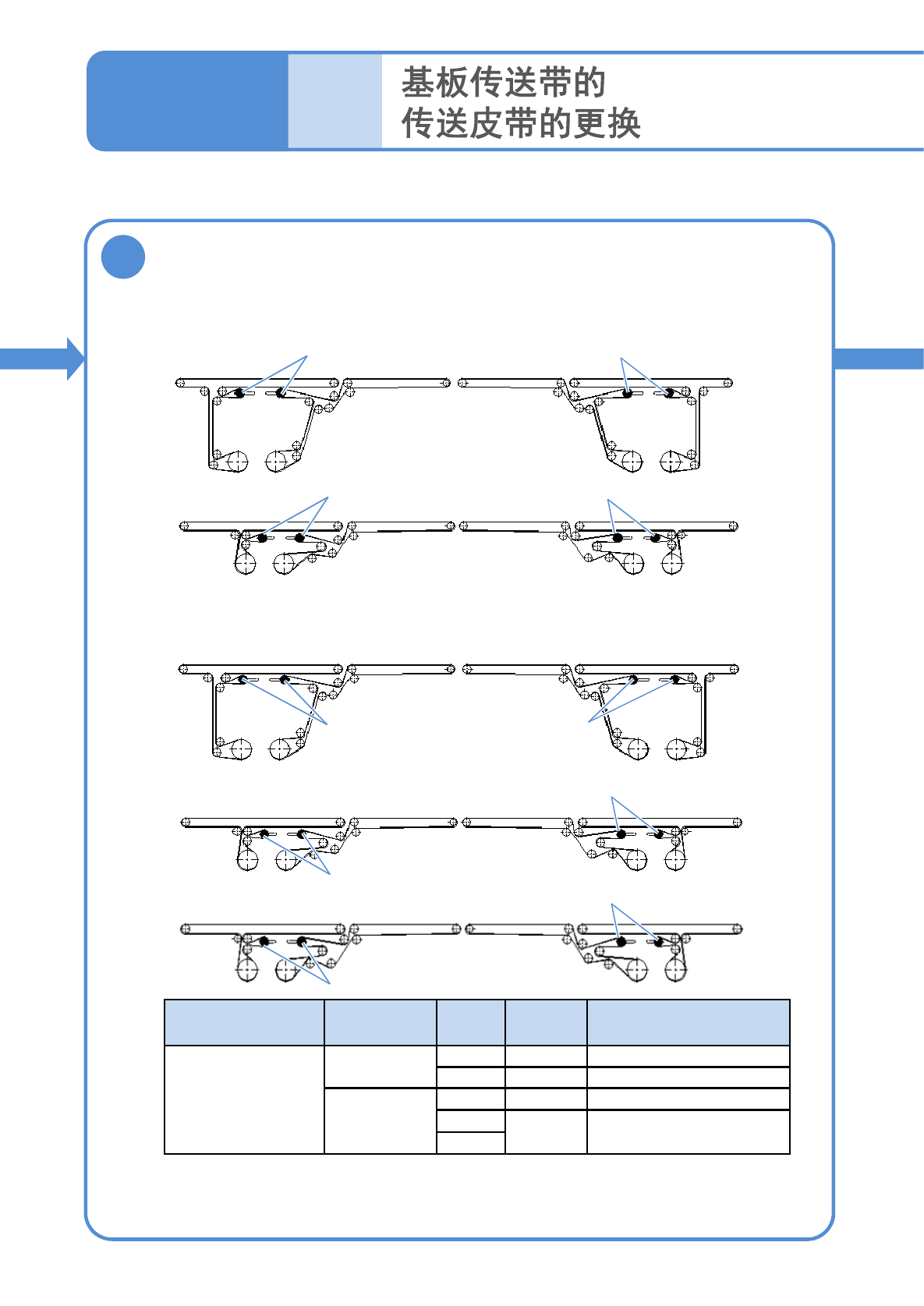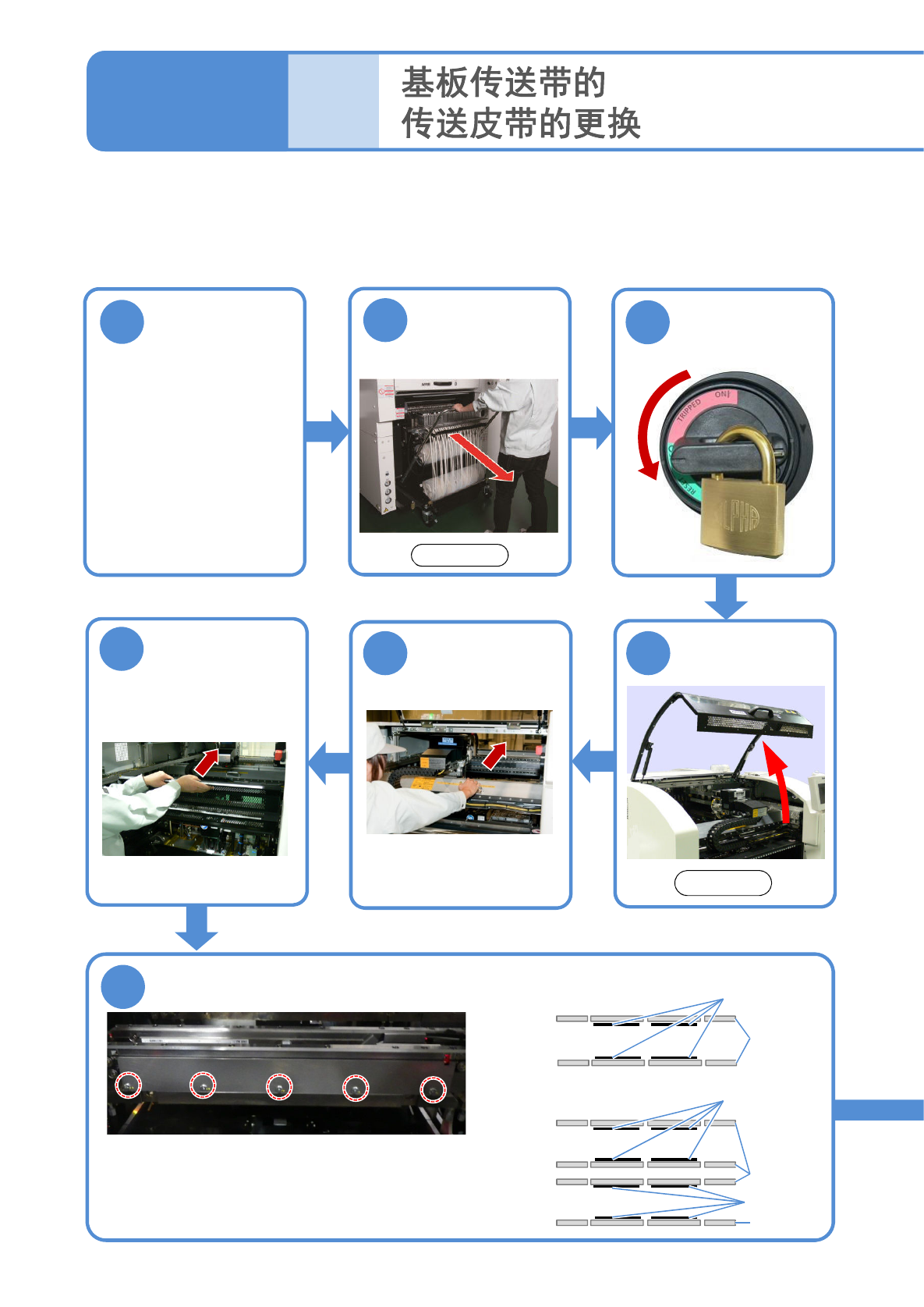 8 卸下皮带 皮带 可动侧 固定侧 ■单轨传送带 : 8 条 ■双轨传送带 : 各轨道上 8 条 可动侧 固定侧 可动侧 固定侧 轨道 1 侧 轨道 2 侧 ●往外拔,将其卸下。 ●废弃时,使用钳子等切断后卸 下。 顺序 9 12-1 -2 ᱉ 㙍 䴬 䜞 Ԭ Ⲻ ᴪ ᦘ