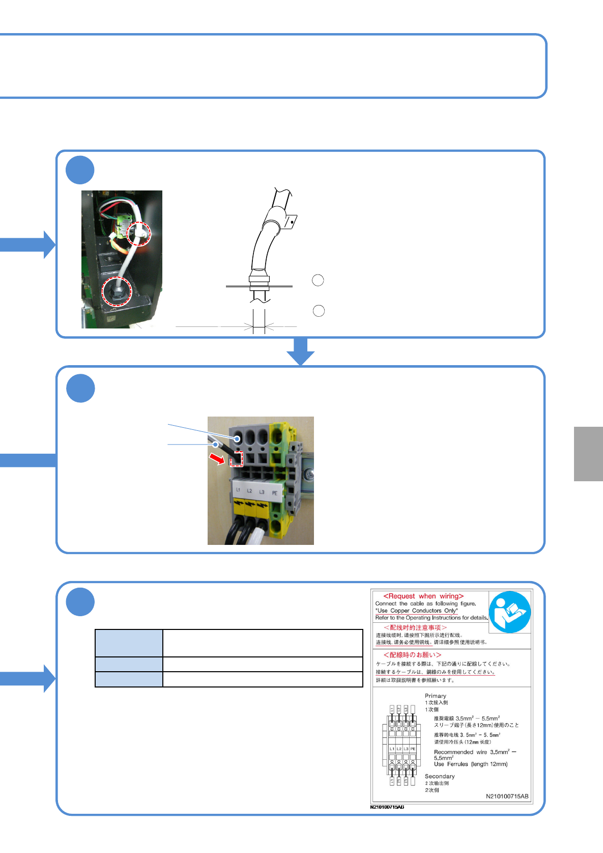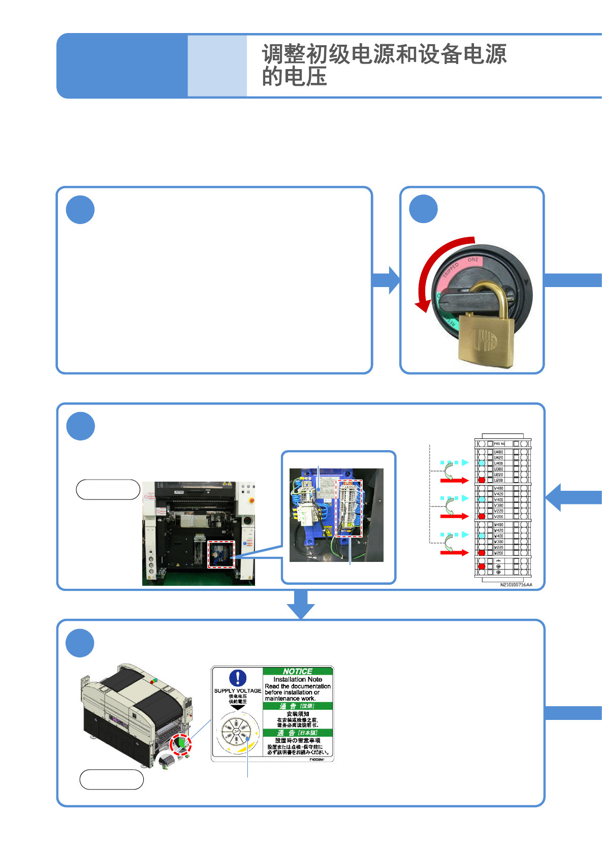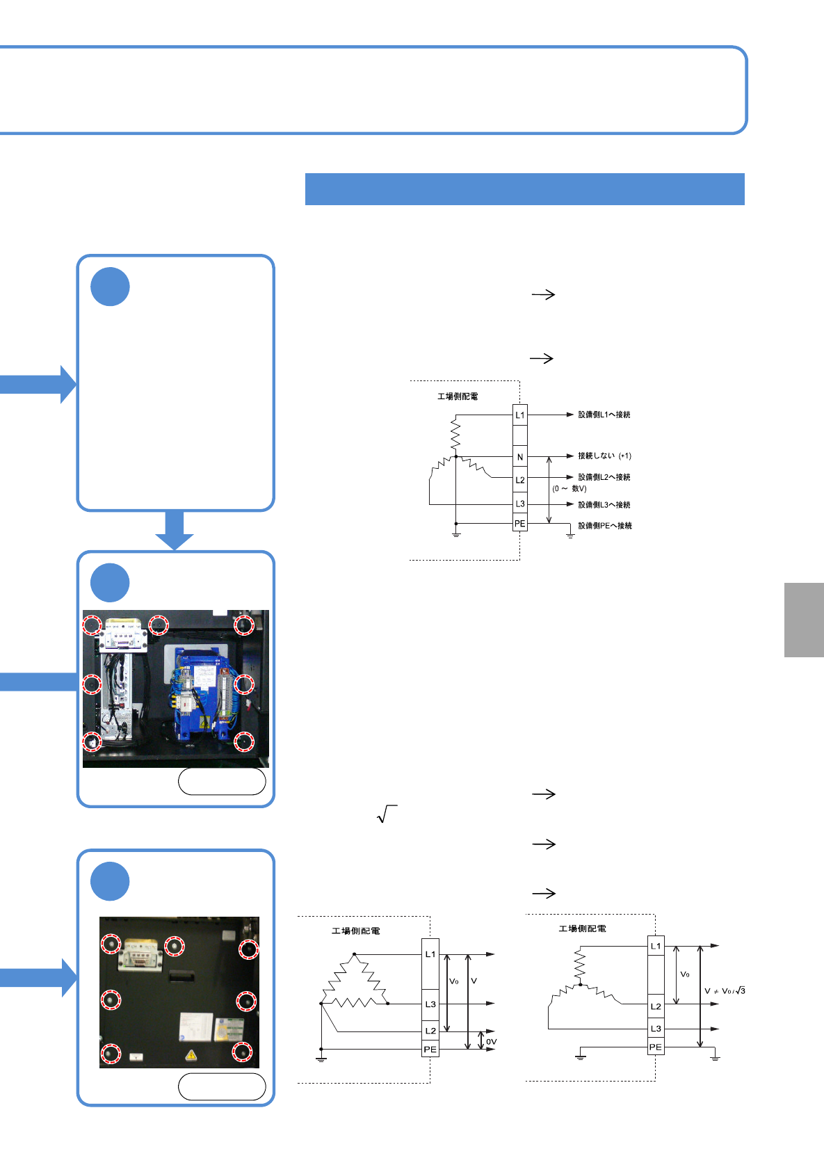NPM-W2 EJM7DC-MB-14M-03 14-4-3 -1 1 切换初级电源的电压 ( 变压器的初级电源电压可以变更为以下电压 ) ●根据供电电压进行调整。 使用工具 : 六角板手 (4 mm) 、附属的专用螺丝刀 ●在 AC 290 V 以上 (A C 380 V 以上的分支 ) 的状态使用时, 请确认地线和各相之间电压处于 AC 290 V 以下,并且供给 电源侧用星形接法将 N( 中性 ) 端子连接到地线。 初级电源和设备…