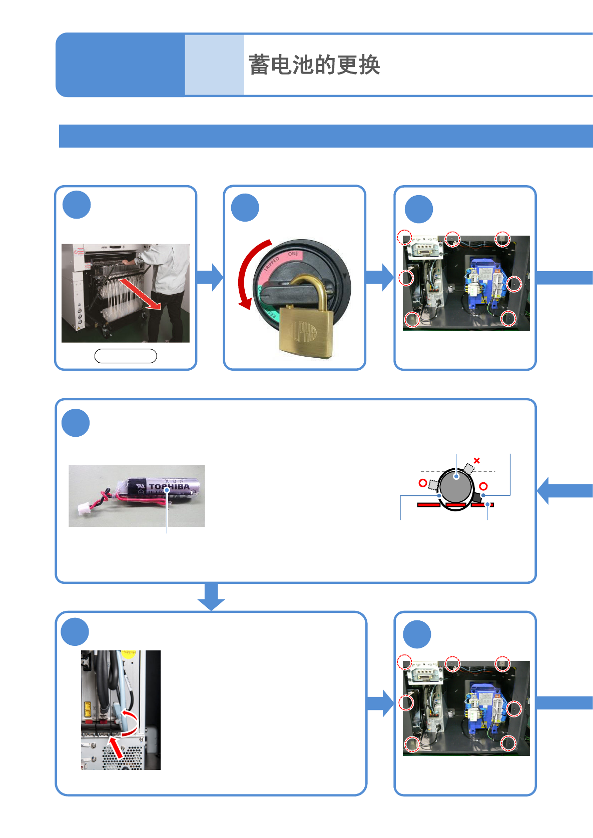 NPM-W2 EJM7DC-MB-12M-07 卸下交换台车 ( → P.3-2) NCIO 板的蓄电池更换 3 7 使用工具 : 十字螺丝刀、六角扳手 (4 mm) 所需时间 :30 分钟 ●请在 2 小时内完成作业。 ●把 NCI O 板插 入,往内侧提起上下 杆并固定。 ●连接电缆。 ●螺丝 (2 个 ) 的 拧紧扭矩 :240 ± 20 cN·m 6 更换新的蓄电池 安装 NCIO 板 蓄电池 ■连接断面图 3 ● 7 个螺丝 …