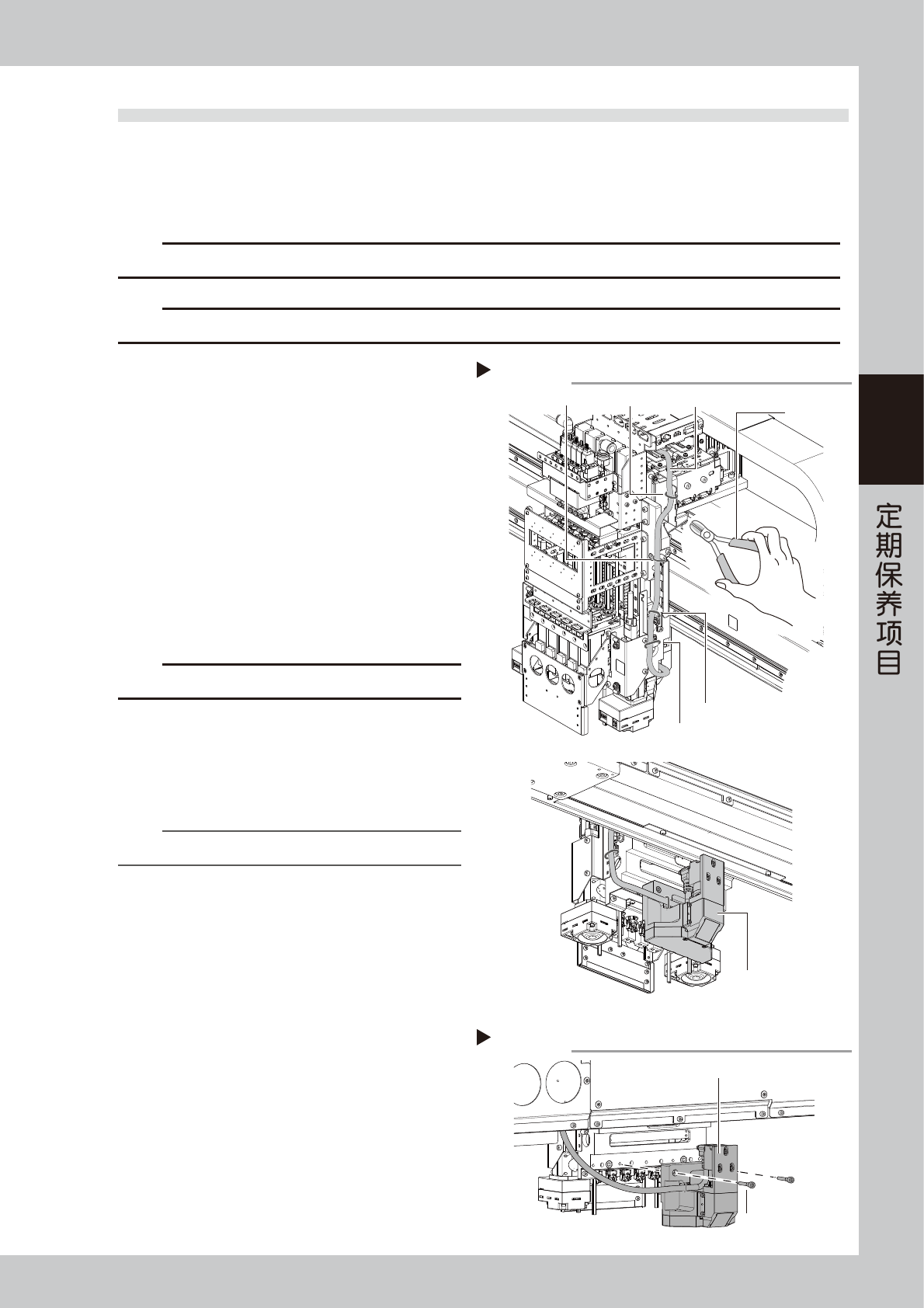 3-68 3 5 暂时固定侧面视觉相机组件。 为便于作业,需将侧面视觉相机组件暂时固定在 X 轴的电缆拖链护盖上。 1. 将侧面视觉相机从 X 轴托架下侧穿过,倒转后放置在 X 轴电缆拖链护盖的上方。 2. 用捆扎带 ( 长度需在 250mm 以上 ) 暂时固定侧面视觉相机组件。 暂时固定侧面视觉相机组件 用捆扎带固定 ■ FM贴装头单元下侧 穿过X轴托架 X轴电缆拖链护盖 X轴托架 侧面视觉相机组件 ■ X轴托架上侧 55389-KM…