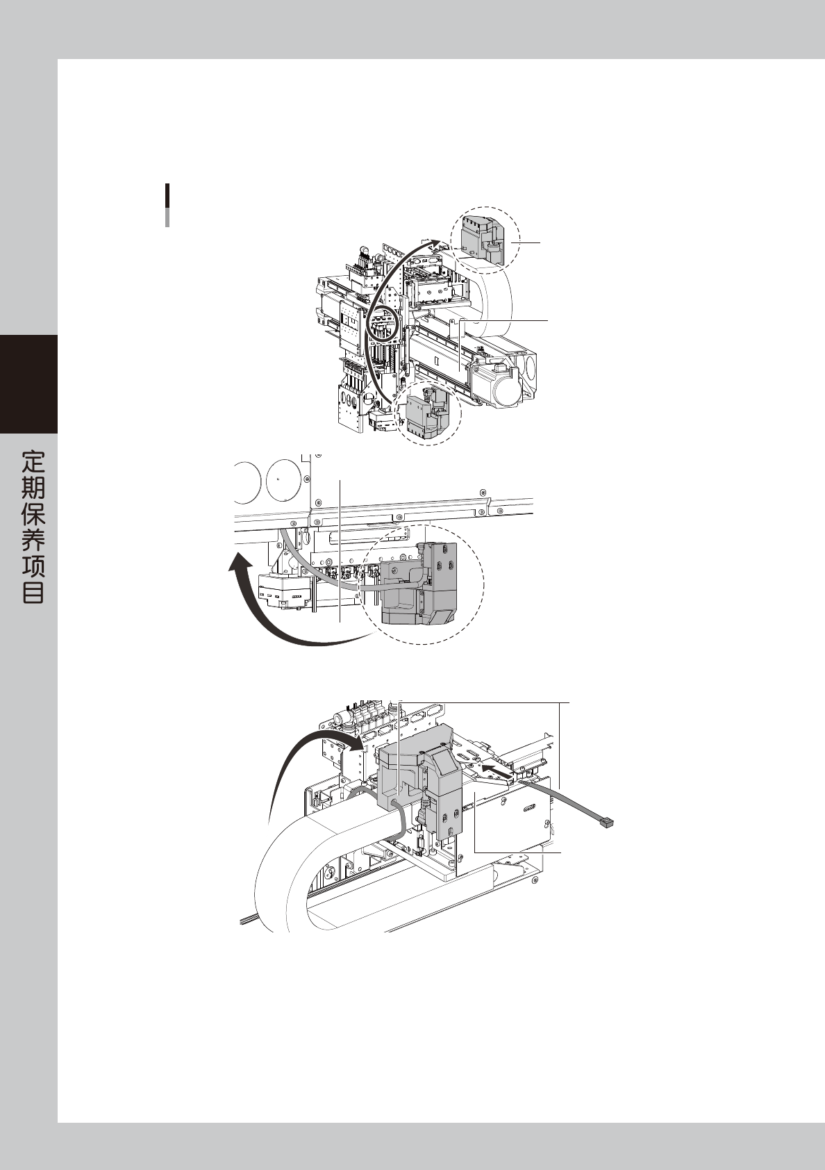 1. 将侧面视觉相机从 X 轴托架下侧穿过,倒转后放置在 X 轴电缆拖链护盖的上方。