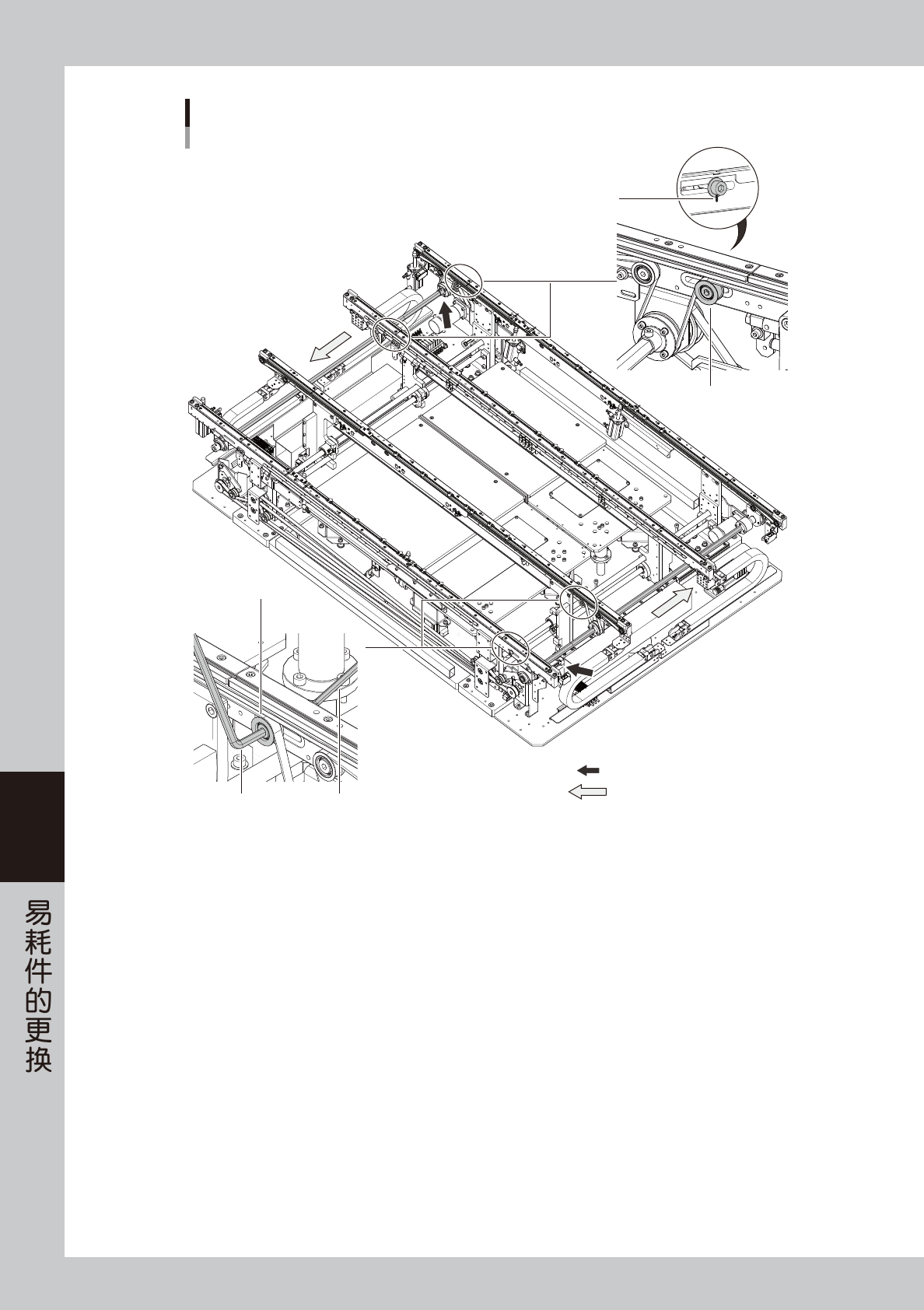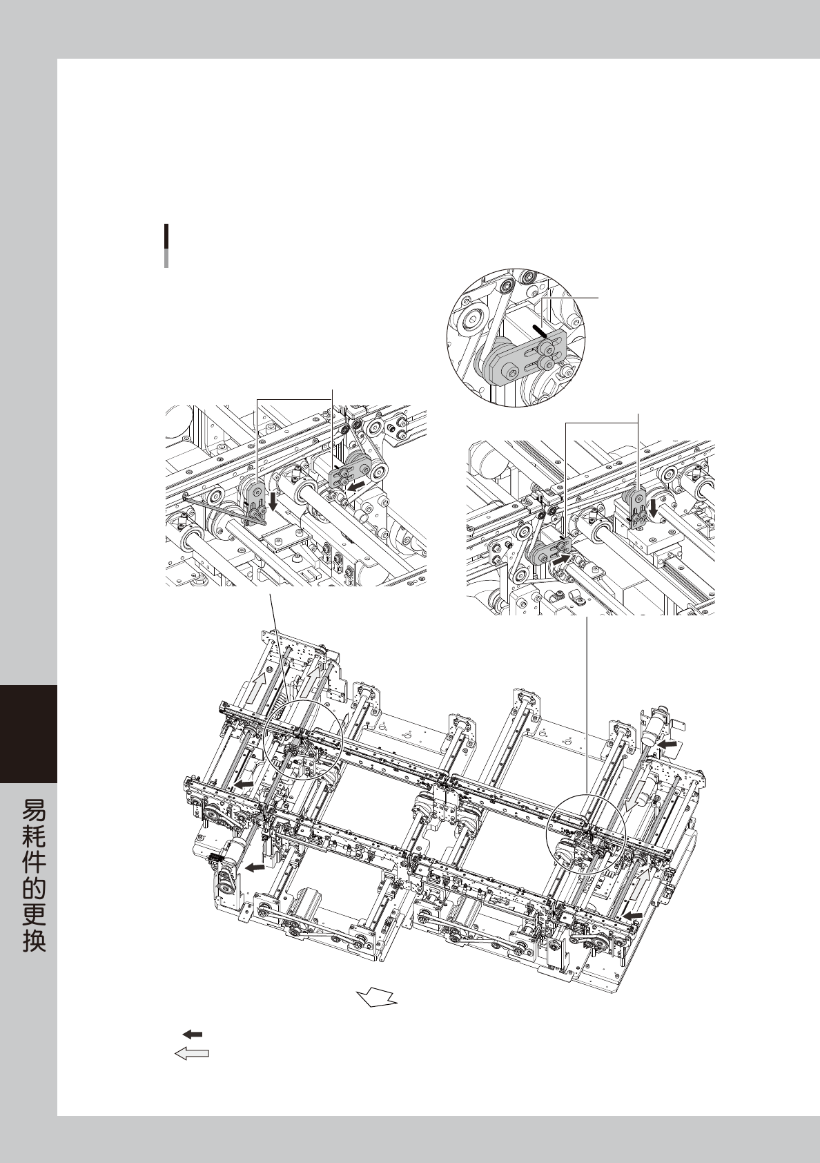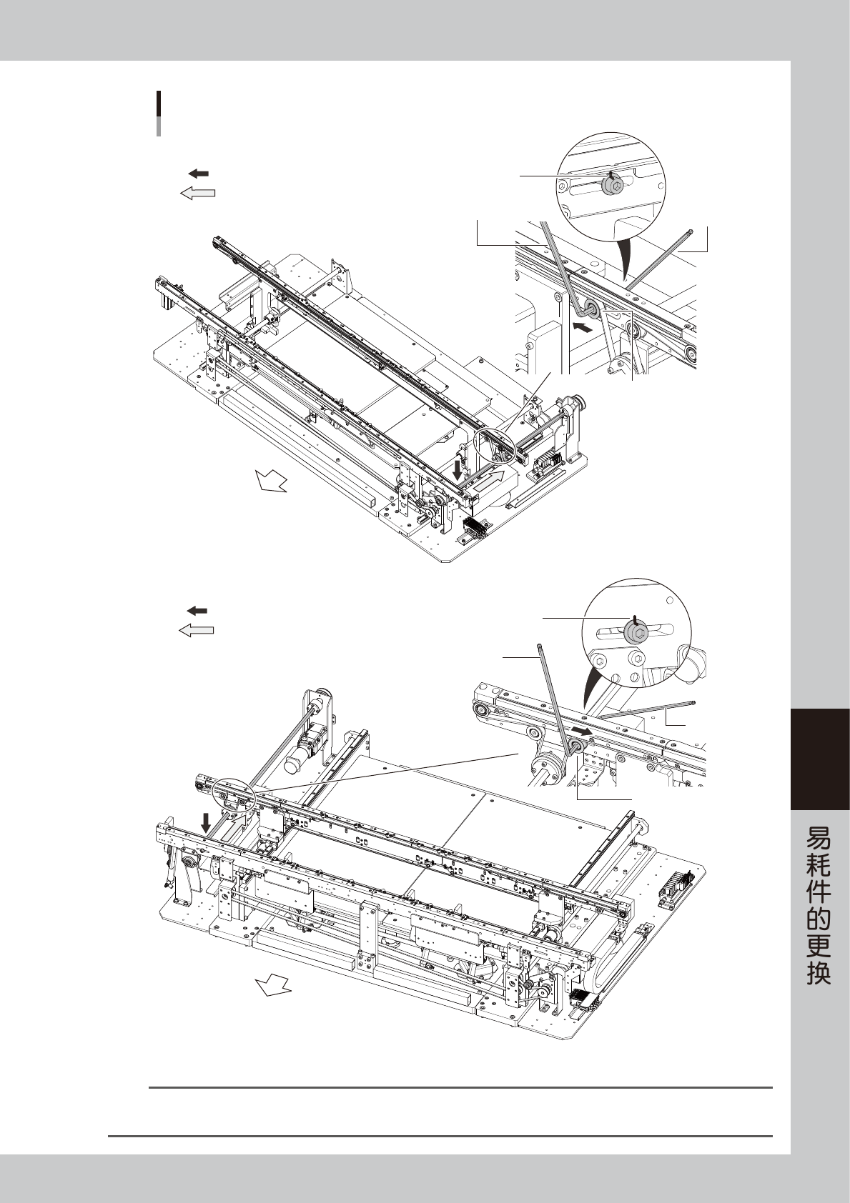 1. 在放松传送带之前,先在带轮托架 (YSM20R、YSM20WR 单轨机型、YSM20WR 双轨机型时在带轮固