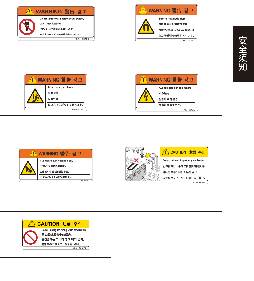 vi ■ 张贴位置 警告标贴 背面 ■ 开闭机盖 (前后) ■ 开闭机盖 (前后) ■ 送料器安装部 (前后) ■ 切带器部 ■ 传送轨开口部 (前后、左右) ■ 开闭机盖内部 (前后) ■ 开闭机盖内部 (前后) ■ 盖板部 95201-KMK-00