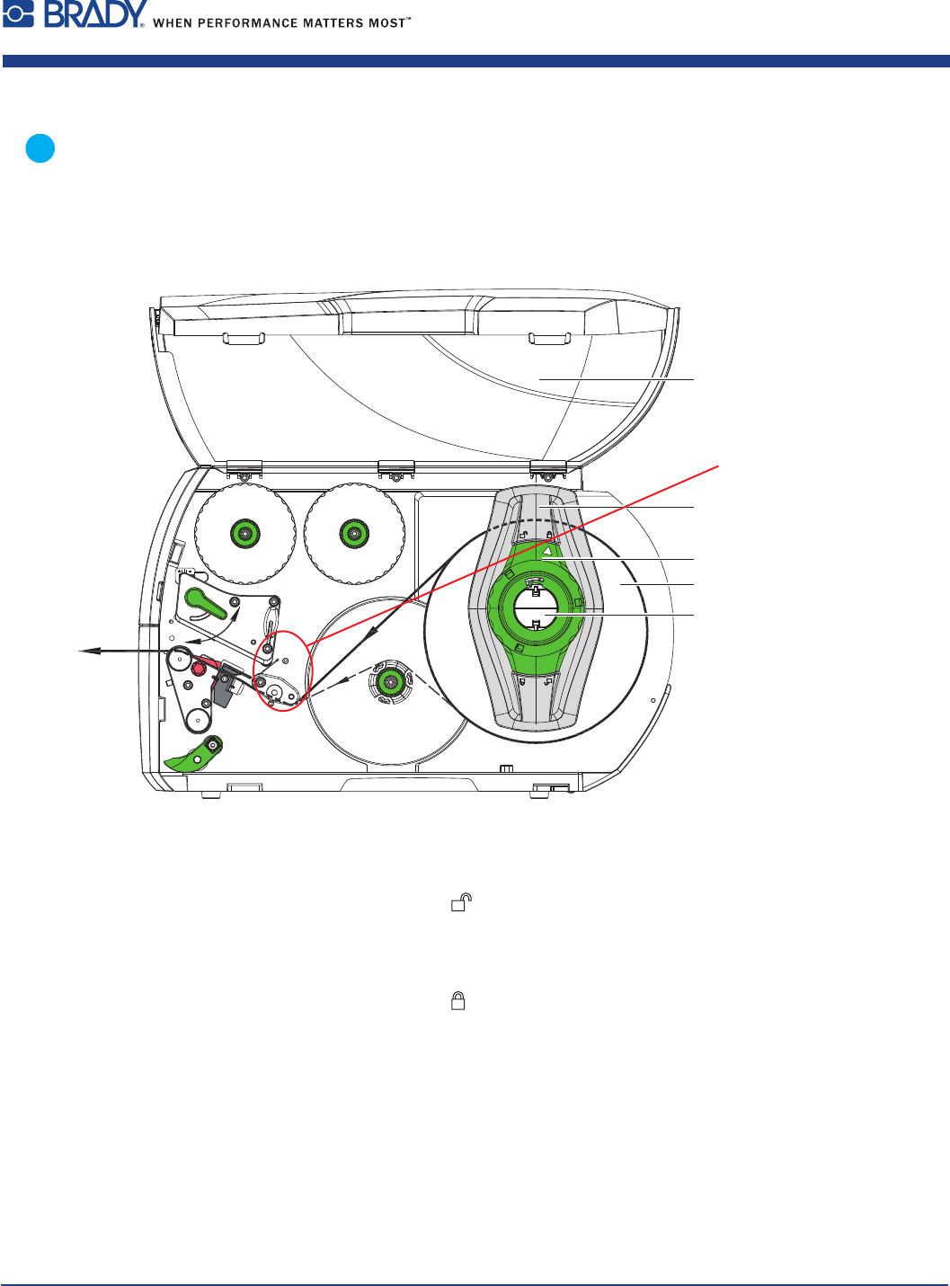 6.請順時鐘方向固定綠色轉盤(3),讓箭頭指向 鎖定符號來將擋紙板(2)固定於紙捲軸上。