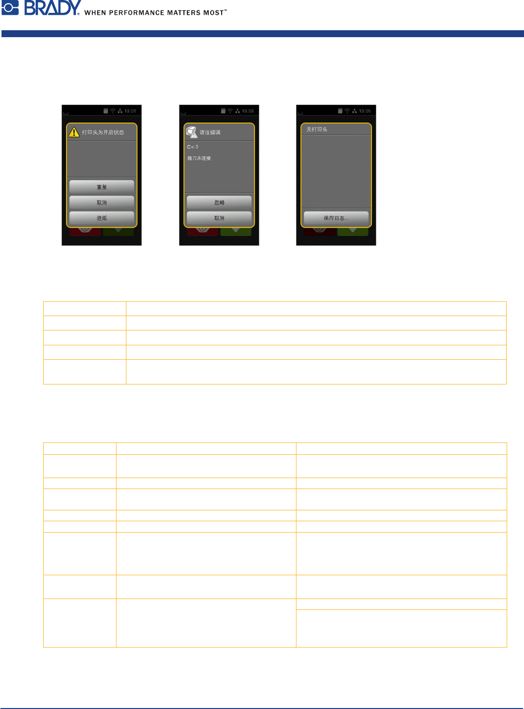 28 操作手冊 10 錯誤排除 10.1 錯誤顯示 若出現錯誤會將此錯誤顯示在屏幕上: 圖21 錯誤顯示 錯誤排除方式取決於錯誤類型 10.2,頁28。 以下提供的選項為錯誤顯示中進一步的操作方式: 重複 排除錯誤原因後可繼續進行打印工作。 取消 取消打印工作。 進紙 重新同步標籤進紙程序。接著就能繼續進行打印工作。 忽略 忽略錯誤通知並繼續打印工作,但功能有可能被限制。 儲存日誌 因錯誤導致無法進行打印操作。 為進…