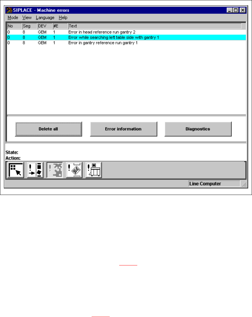 4 Placement functions SIPLACE 80S-20 /F4 User Manual 4.2 Error display Software version SR. 407.xx 01/2001 US E dition 160 4.2.3 "Mach ine errors" v iew 4 Fig. 4.2 - 2 "Machine errors" view 4.2.3.1 Me…