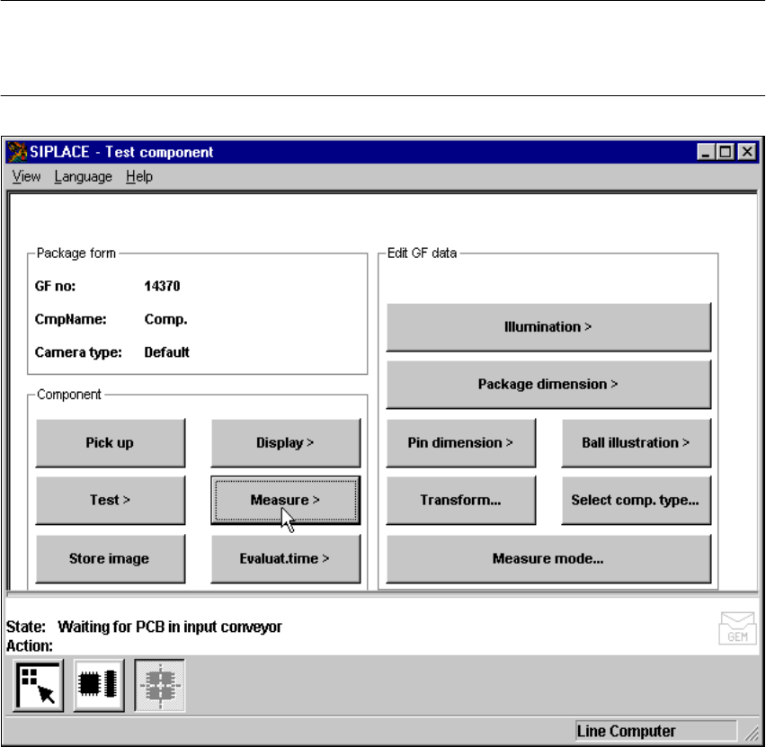 SIPLACE 80S -20/F4 User Manual 6 Vision functions Software version SR.407.xx 01/2001 US Edition 6.6 Test Component 297 6.6.4.4 Measure Component Option NOTE 6 This op tion can onl y be activ ated if you ha ve alrea dy lo…
