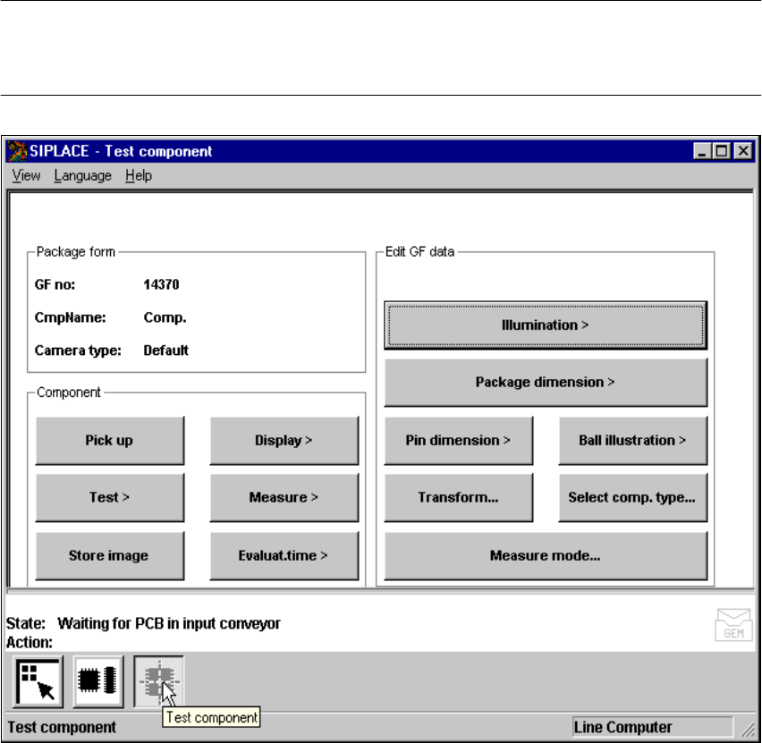 6 Vision functions SIPLA CE 80S-20/F4 User Manual 6.6 Test Co mponent Software version SR.407.xx 01/2001 US Edition 310 This me nu allows y ou to chan ge 6 – the lead dime nsions, – the package dim ensions, – the bal l i…