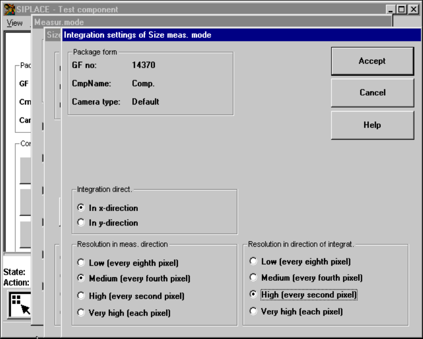 SIPLACE 80S -20/F4 User Manual 6 Vision functions Software version SR.407.xx 01/2001 US Edition 6.6 Test Component 325 6.6.4.16 ‘ Size ’ measuring mode Click on th e ‘ Sett ing ’ fiel d for the ‘ Size ’ meas uring mo de …