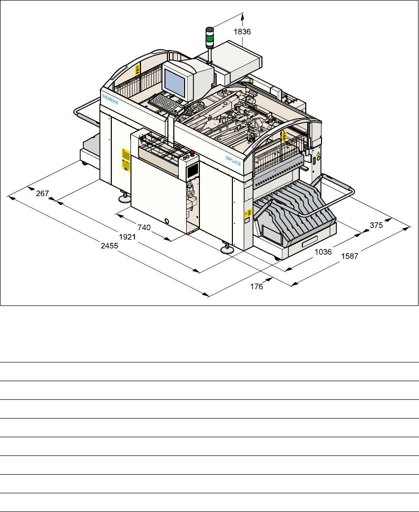 1 Introduction SIPLACE 80S-20 /F4 User Manual 1.9 Dimensions and weight of the mac hine Software version SR. 407.xx 01/2001 US Edition 44 1.9 Dimensions and weight of the machine 1.9.1 Dimensi ons of the machine Fig. 1.9…
