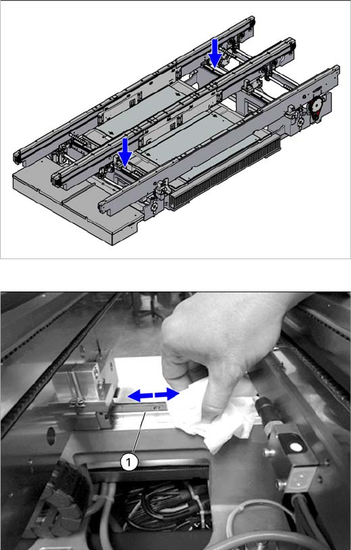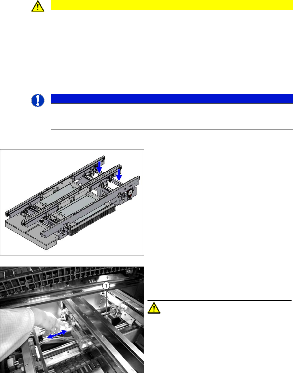 Major Maintenance 5.6.3 Durchführen der Instandhaltungstätigkeiten Instandhaltungs tätigkeiten Transport Instandhaltungsanleitung SIPLACE SX1/SX2/DX1/DX2 69 Reinigen und Konservieren der Linearführungen SXDX12 V 1 Reinig…