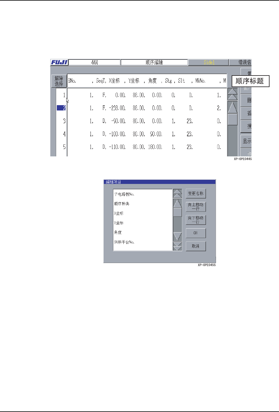 SYS-XP243-4.0S 4. 机器生产程序 XP-242E/243E 系统手册 199 项目编辑功能 顺序编辑画面的项目中,可以变 更排列顺序以及项目名。 操作步骤 1. 按下顺序的标题部分。 2. 显示出 [ 项目编辑 ] 对话框。按下按键变更顺序标题的排列顺序以及项目名称。