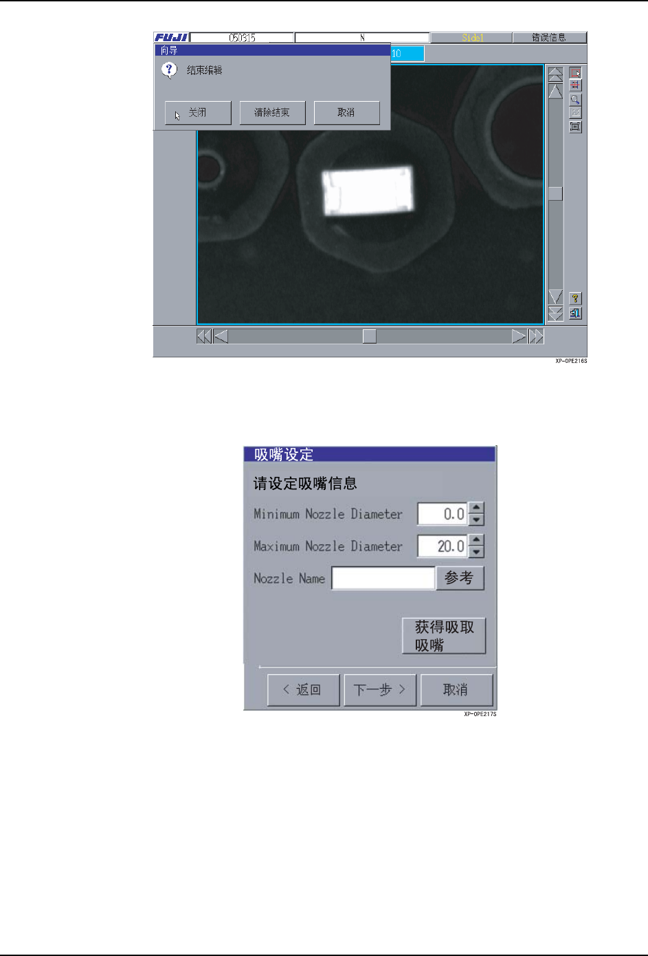 5. MDW/PDW SYS-XP243-4.0S 318 XP-242E/243E 系统手册 4. 显 示出 [ 吸嘴设定 ] 对 话框。 设定吸取使用的编辑模板的元件 时的吸嘴信息。按下 [ 参考 ] 按键后,显示出 [ 选择吸 嘴 ] 画面。输入吸嘴信息或者选 择后,按下 [ 下一步 ] 按键。