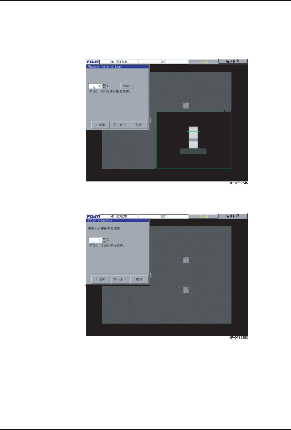 SYS-XP243-4.0S 5. MDW/PDW XP-242E/243E 系统手册 333 8. 显 示出 [Meas ure Point of Lead]对 话框。 从编辑影像测定引脚要素的亮度,在画面右下方显示出一根虚拟的针。 根据必要可以设 定识别引脚的位置。 设定的部分由绿线进入。 另外, 按下[Auto] 按键后, 机器求出推荐值后 可以自动设定。 设定后,按下 [下一步]按键。 9. 显 示出 [Pitc h Toler…