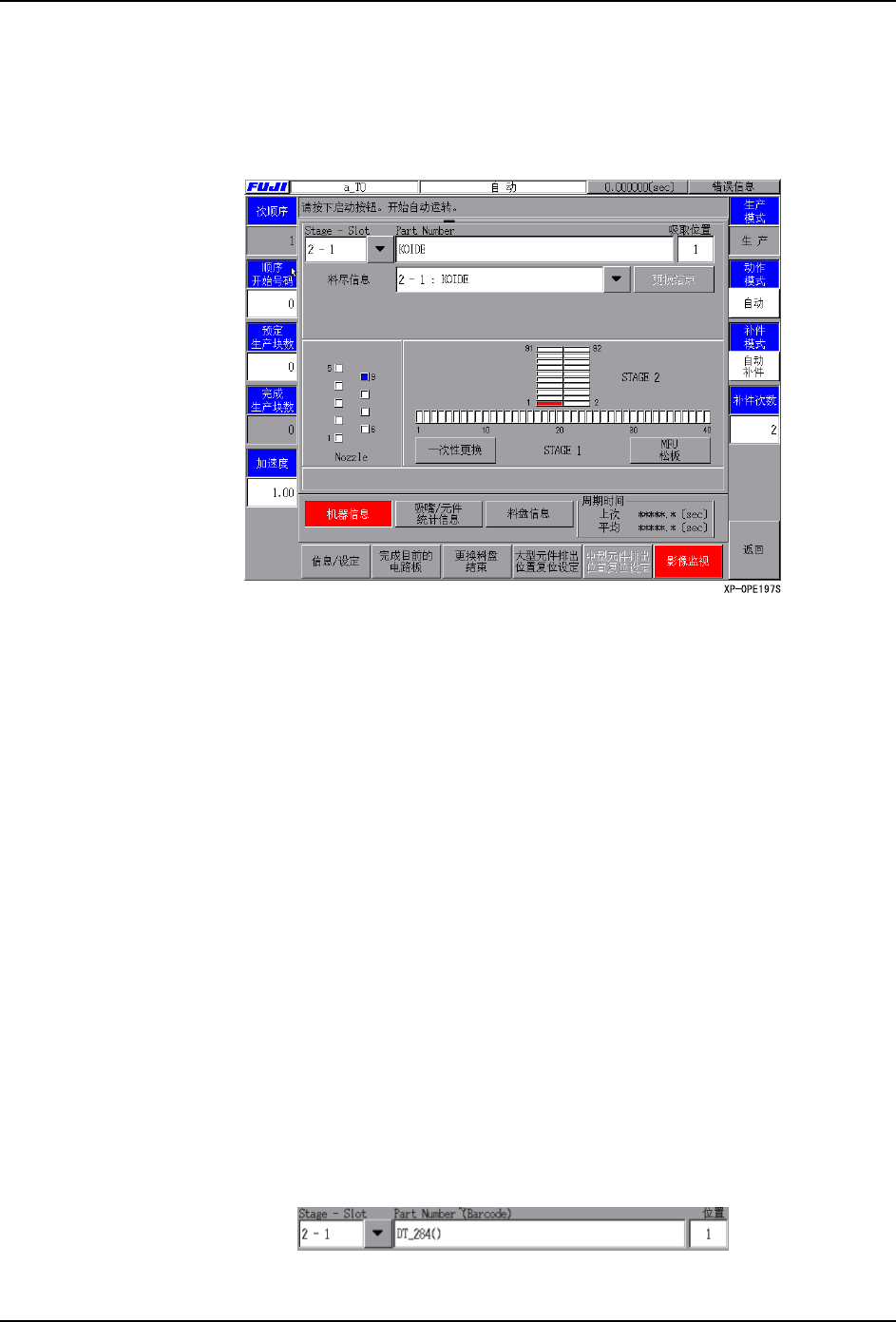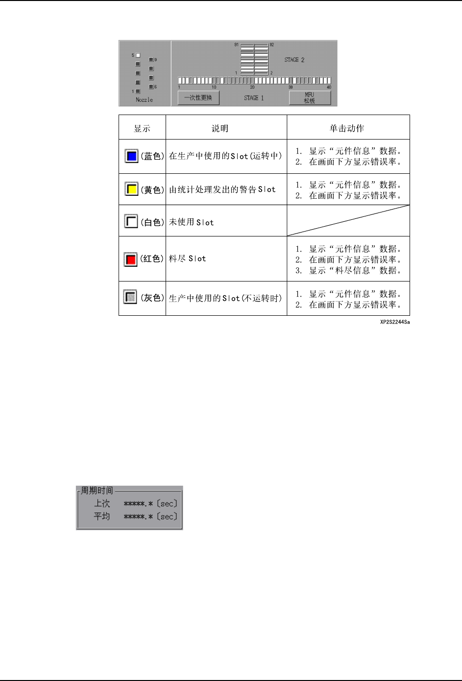 3. 操作系统 SYS-XP243-4.0S 76 XP-242E/243E 系统手册 显示设定在生产程序中的平台、 料站信息。 显示机器判断为 [ 料尽 ] 的料站。 按下 [ 元件设定结束 ] 按钮后,机器进入元件安装状态。 在以下的区域中显示出各个吸嘴 的状态。