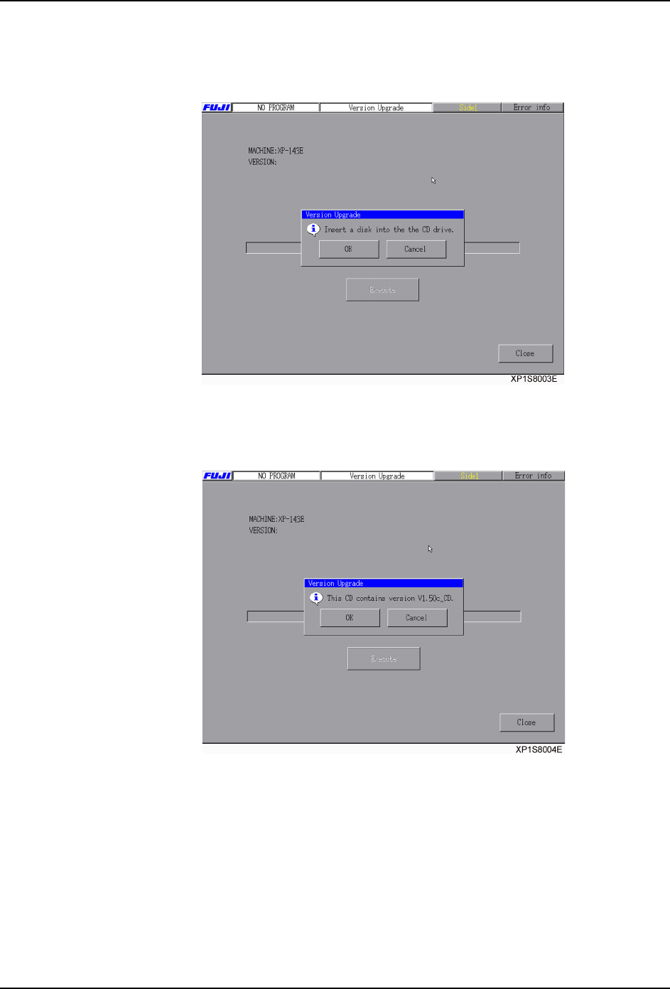 SYS-XP243-4.0S 3. 操作系统 XP-242E/243E 系统手册 159 后期模组时的操作步骤 1. 在 [ 主画面 ] 上选择 [ 维修保养 B]、 [ 版本更新 ], 显示出以下版本更新画面。 请将版本 更新的 CD 插入到 CD 驱动器中后选择 [OK] 后,结束 [ 版本更新 ] 画面。 备注 )在放入版本更新 CD 的状态下,选择 [ 版本更新 ] 画面后,从项目 2. 开始。 2. 显示出版本更新 CD 的版…