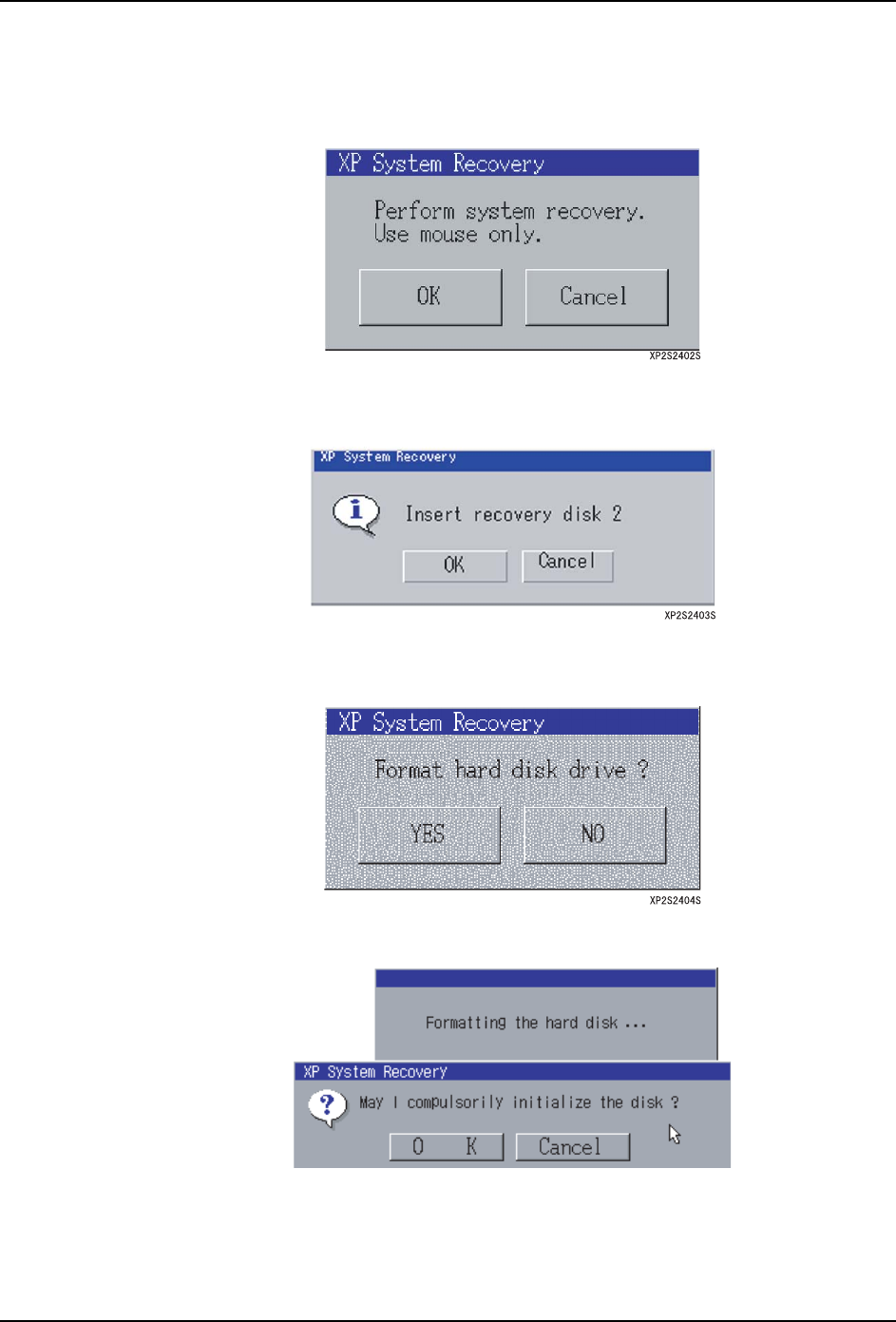 3. 操作系统 SYS-XP243-4.0S 162 XP-242E/243E 系统手册 用复位启动盘启动 XP 机器 操作步骤 1. 在 FDD 上安装 「复位启动盘」 ,接通 XP 的电源。启动后显示以下对话框。 2. 单击 [ 取消 ] 键,中断复位处理并关机 。 单击 [OK] 键后显示出以下对话框。请插入 「复位启动盘 2」 。 3. 单击 [OK] 键后显示出进展对话框, 复制需要的文件。 单击 [ 取消 ] 键, 中断复位…