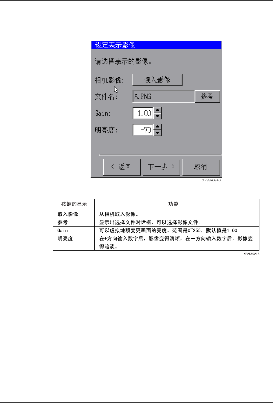 SYS-XP243-4.0S 5. MDW/PDW XP-242E/243E 系统手册 281 7. 显示出 「显示影像设定」对话框后,按下 [ 取入影像 ]、[ 启动 ] 按键,取入影像。 信息消除后按下 [ 下一步 ] 按键、信息没有消除时调整 Gain+ 明亮度后,请按下 [ 下一 步 ] 按键。 操作按键说明。