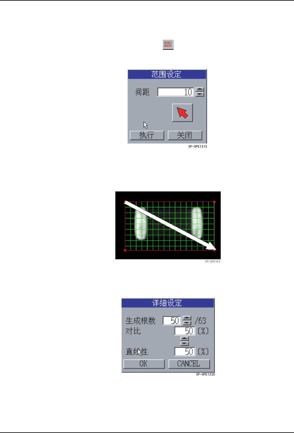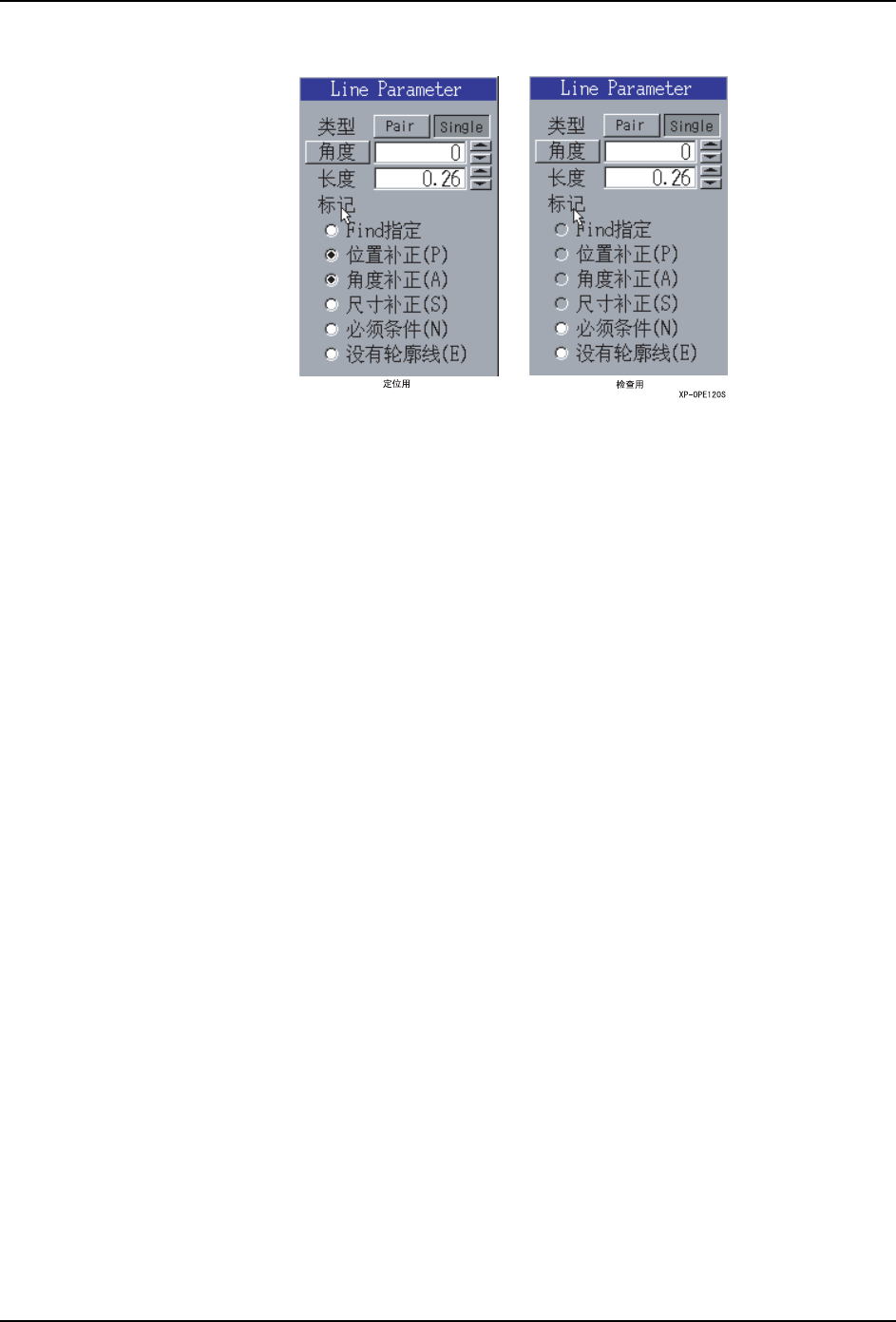 SYS-XP243-4.0S 5. MDW/PDW XP-242E/243E 系统手册 313 [Line Param eter] 对话框项目说明 类型按键: 设定查找线的类 型 (Pa ir/Single) 。 角度按键: 使用角度按键,对于轮廓可以设定 垂直相交的查找线。 角度自动生成即 使用类型按键选 择 [Pair] 也只能生成 Single 查找线。 角度编辑框: 可以从 -360 到 +360 输入查找线的角度。单位 是 (…
