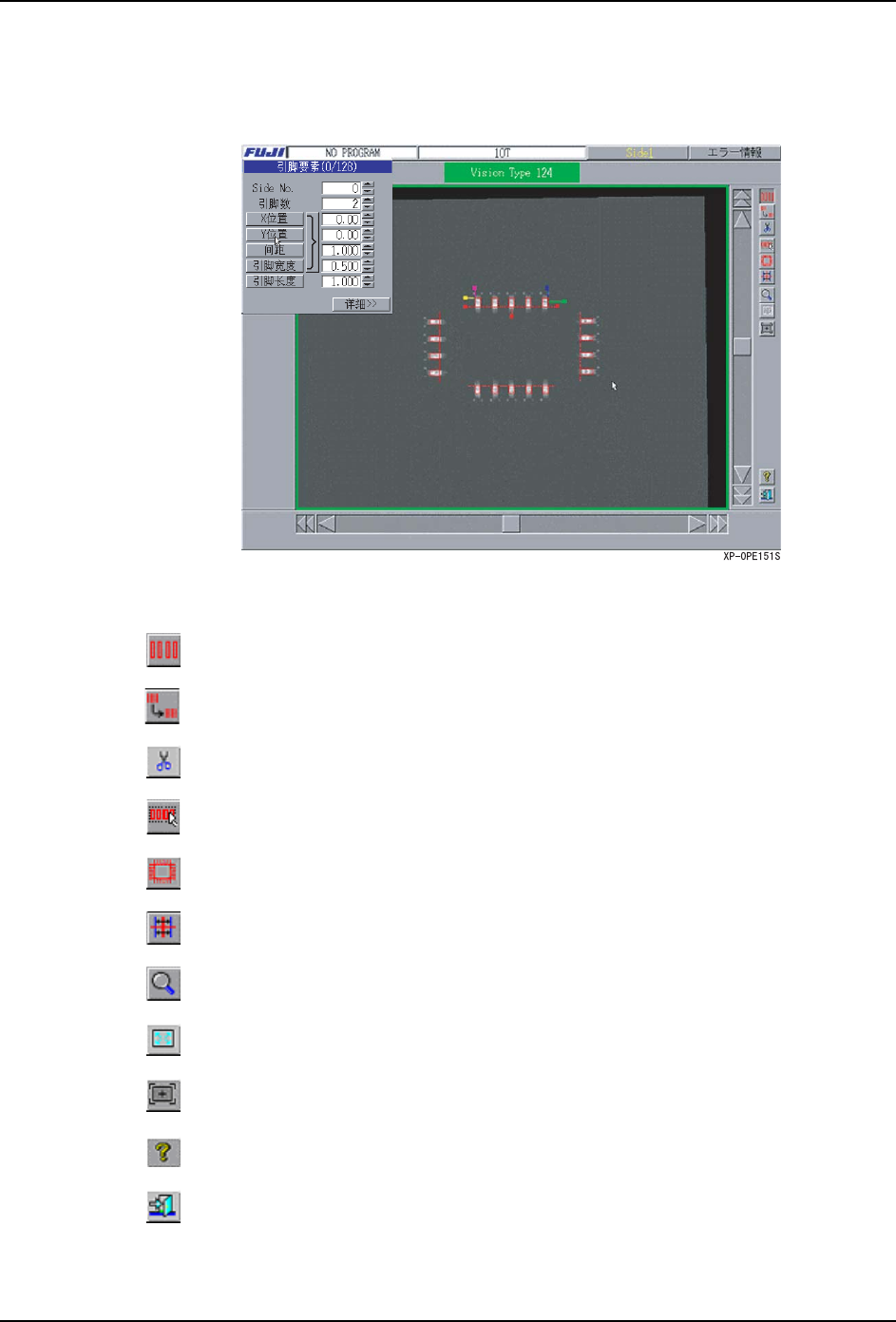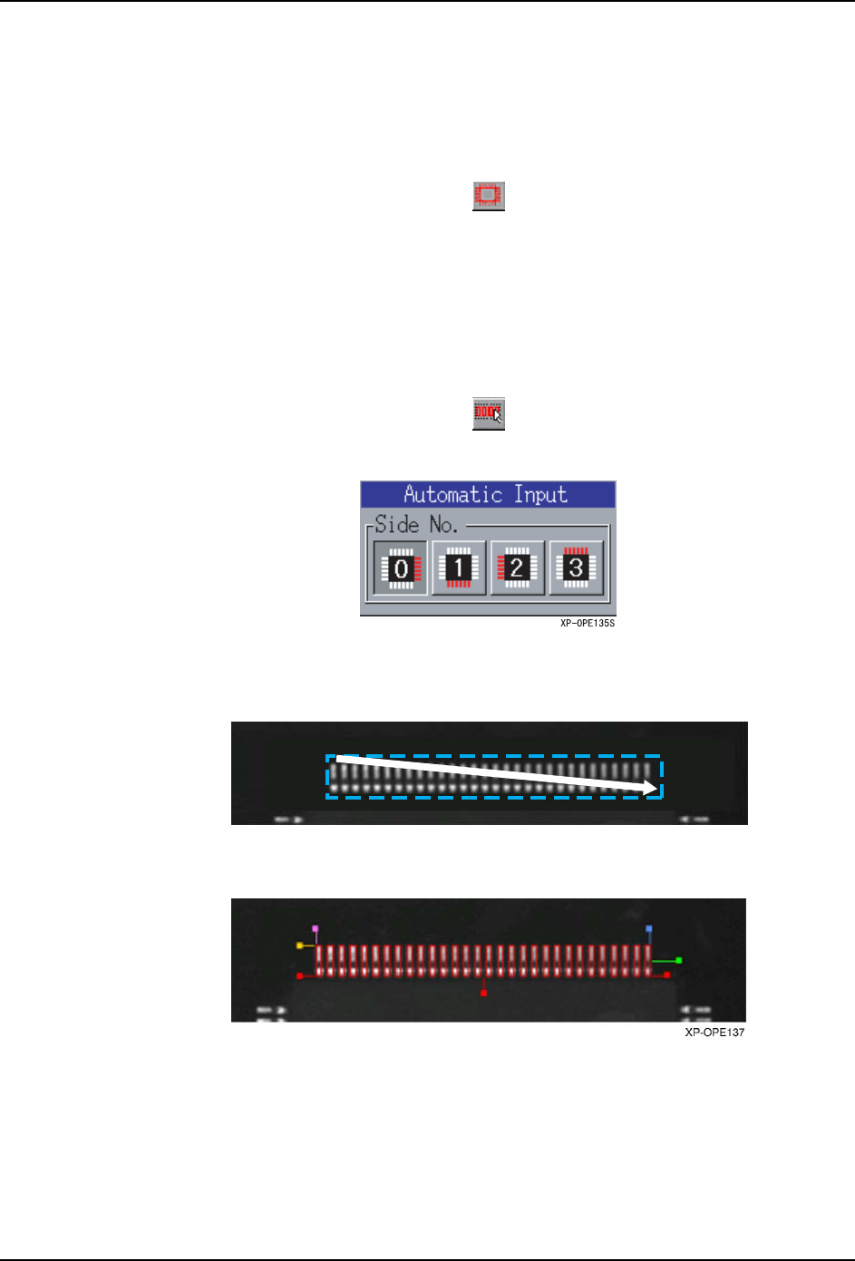 5. MDW/PDW SYS-XP243-4.0S 348 XP-242E/243E 系统手册 由全自动输入模式输入 请使用在元件主体的一边上只存 在一个要素的元件。 操作步骤 1. 按下下图。 2. 由影像处理自动生成引脚要素。 3. 有必要时再次进行卡尺测定,进行元件影 像的位置或者倾斜度的补正。 由自动输入模式输入 1. 按下下图。进入引脚要素自动输入模式。 显示出 [Automatic Input] 对话框。 2. 用 [Sid…