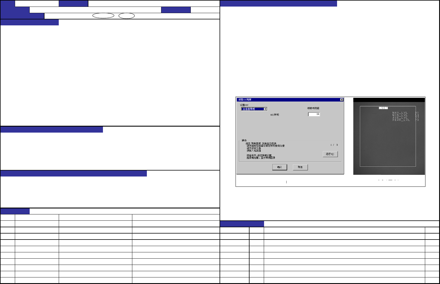 QA表 NO. 2 (1/2) NO. 2 (2/2) 机种 ①手动控制,确认OCC 垂直照明和角度照明的亮灯情况。 ※确认所有的 OCC。 ②前后转动偏光滤光镜,确认是否达到最亮的状态。 ③确认测定蚀前后的安全护罩是否关闭。 (角度照明) LGET 输出结果 AVE_LVL = 95±1 ④按照MS参数的指示,把白色陶瓷基板设置到 CAL块上。 (垂直照明) LGET 输出结果 AVE_LVL = 48~45 ※确认是否显示标准电流值…