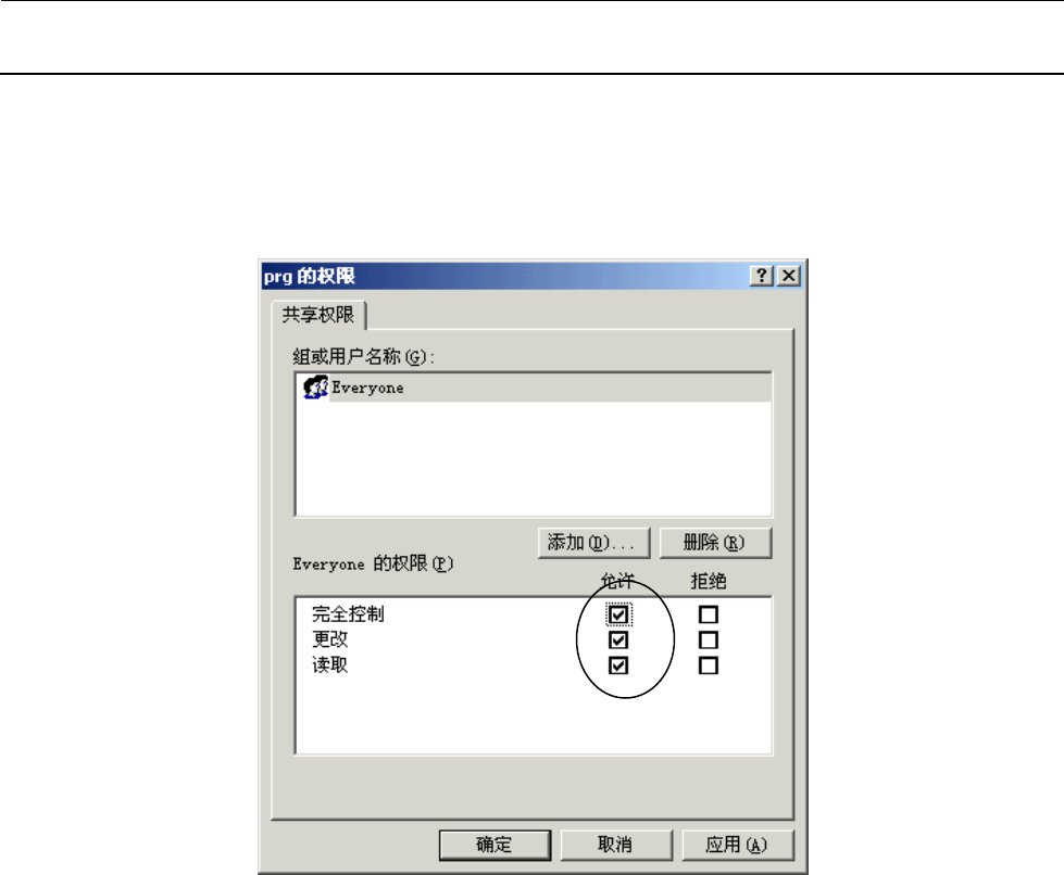 7)在上述画面中,请选择③<权限(P)>按钮,以显示「prg 的权限」对话框。这里,在 everyone 的