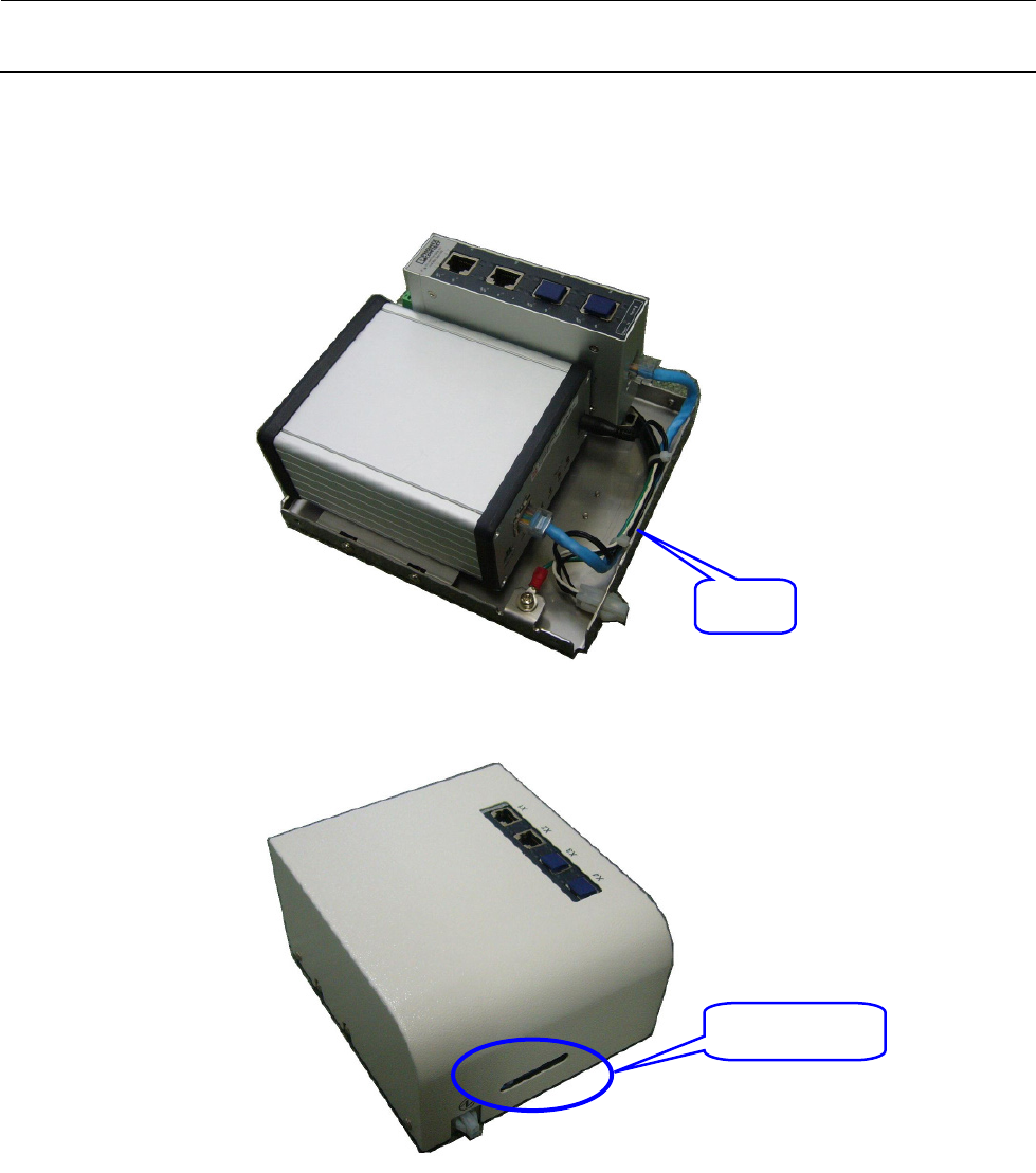 (3) 从新安装护罩时,图中所示的电缆不要挂住护罩窗口部,并请确认从窗口部看得到 LED 灯。