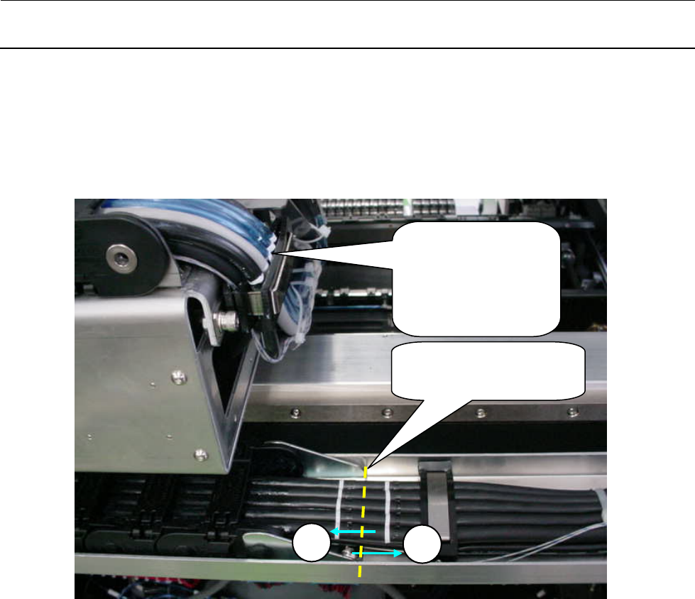 维修调整要领书 1- 42 3 ) 在电缆的贴装头一侧,将各电缆的记号位置与「 FC 支架」的上端对齐,予以固定。 4 ) 在反方向一侧, 将电缆向图示的①方向拉, 并在此状态下在安装夹具前端做记号, 接着朝②方 向推入,同样在此状态下划上记号。(参照下图) 5 ) 使 2 个记号的中心位置位于安装夹具前端,用电缆夹 X 卡住电缆予以固定。 图 1-9-3-3 6 ) 用手把塑料导轨内部的线束揿进,确认没有挠曲。 400 58385 (…