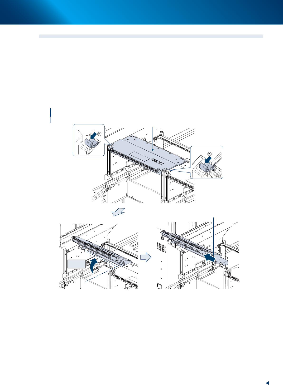 作业前 2-4 第 2 章 日常保养项目 █ 导槽盖板的安装 1. 用手搬动导槽盖板的前端部,使导槽盖板的导槽部与前端部呈下图所示角度 (30 度 )。 2. 将导槽盖板以约 30 度的角度对准贴片机并插入。此时,导槽盖板左右两侧的前端定位销和后方定位销, 如下图所示分别插入各自的定位槽中。 3. 关闭导槽盖板。只要正确关闭导槽盖板,导槽盖板左右的锁扣将发出“咔嚓”声响。 约30度 安装导槽盖板 约30度 ■ 侧视图 导槽盖板的导槽部 …