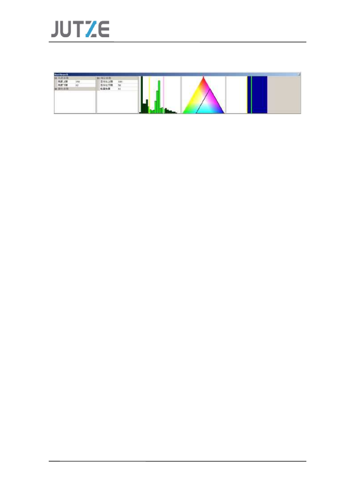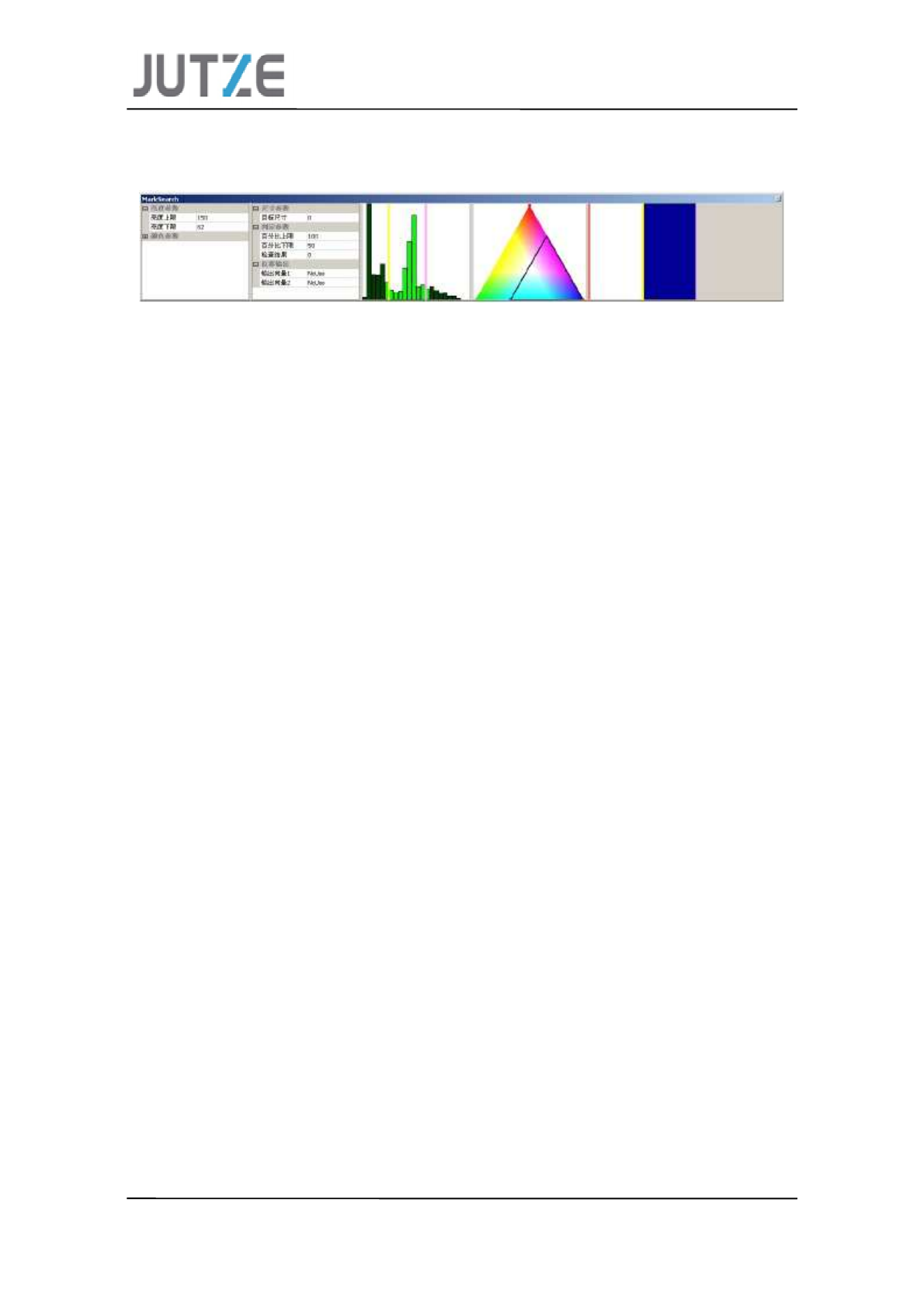 Mark Search 计算参数: 亮度参数(可用鼠标通过直方图 来设定) : a) 亮度上限 : 设定最高亮度值 ( 0~255 ) a) 亮度上限 : 设定最高亮度值 ( 0~255 ) b) 亮度下限:设定最低亮 度值( 0~255 ) 颜色参数(可用鼠标通过色彩图 来设定) : c) 红色上限:设定红色最大值 ( 0~173 ) d) 红色下限:设定红色最 小值( 0~173 ) e) 绿色上限:设定绿色最大值 ( 0~173 …