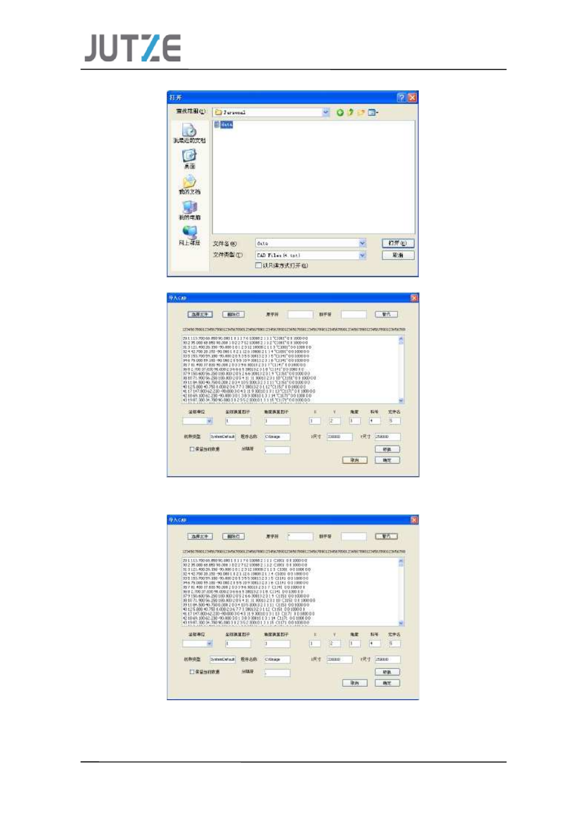 ( 2) 选择文件(文件格式: *.txt;*.csv ) a 用删除行 将不必要的行删除 b 原字符(格式里不需要的字符 “ " ” )替代 成新字符 “ 空格 ” ( 3) 读取数据后整理数据 ( 4 ) JUTZE 软件中采用 um 作基准单位,所以转换前 需要确认 \ a) 导入 CAD 数据采用的是英制或是公制 b) X/Y 坐标换算因子是否一致(单位是否 同为 um ) 30