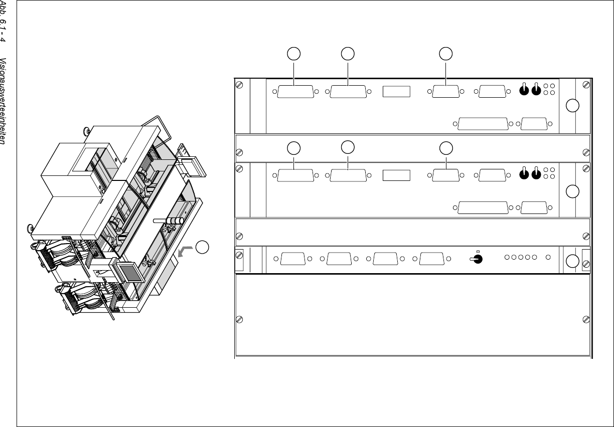 Betriebsanleitung HS-50 6 Visionfunktionen Software-Version 5.01 A usgabe 01/99 6.1 Die Visionsysteme am Automaten 195 /HJHQGH]X$ EE (1) Visiona uswerteeinh eit MV S 340, Por tale 1 und 4 (2) Visiona uswertee…