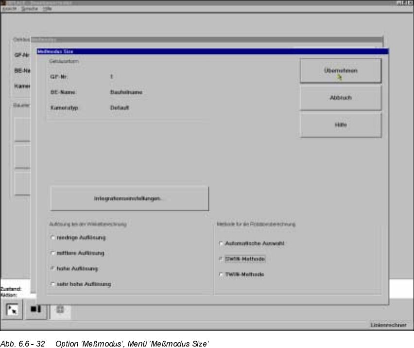 Nach Anklicken der Schaltfläche ’Einstellen’ des Meßmodus ’Size’ wird das Menü ’Meßmodus