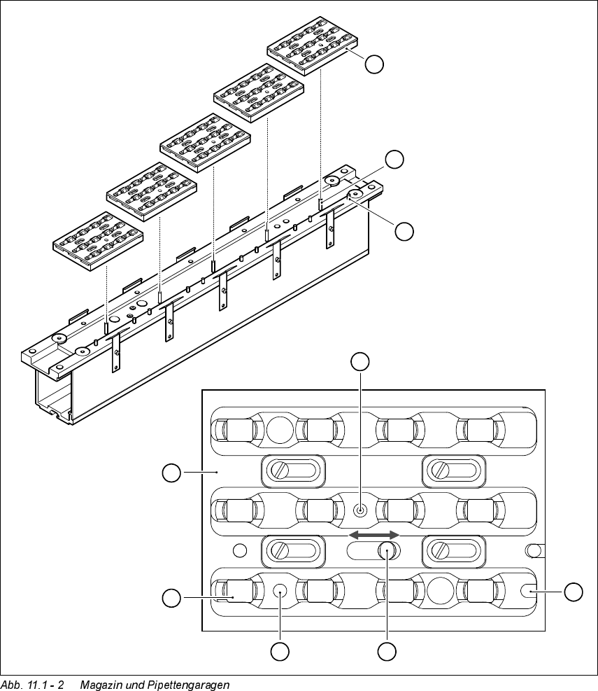 den Zahlen 1 bis 5 gekennzeichnet. Die Pipettengaragen sind in den Magazinen von 1 bis 12