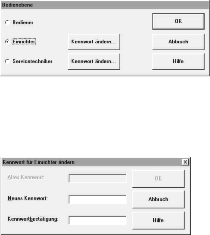 die Bedienebenen "Einrichter" und "Servicetechniker" können Kennwörter vergeben werden.