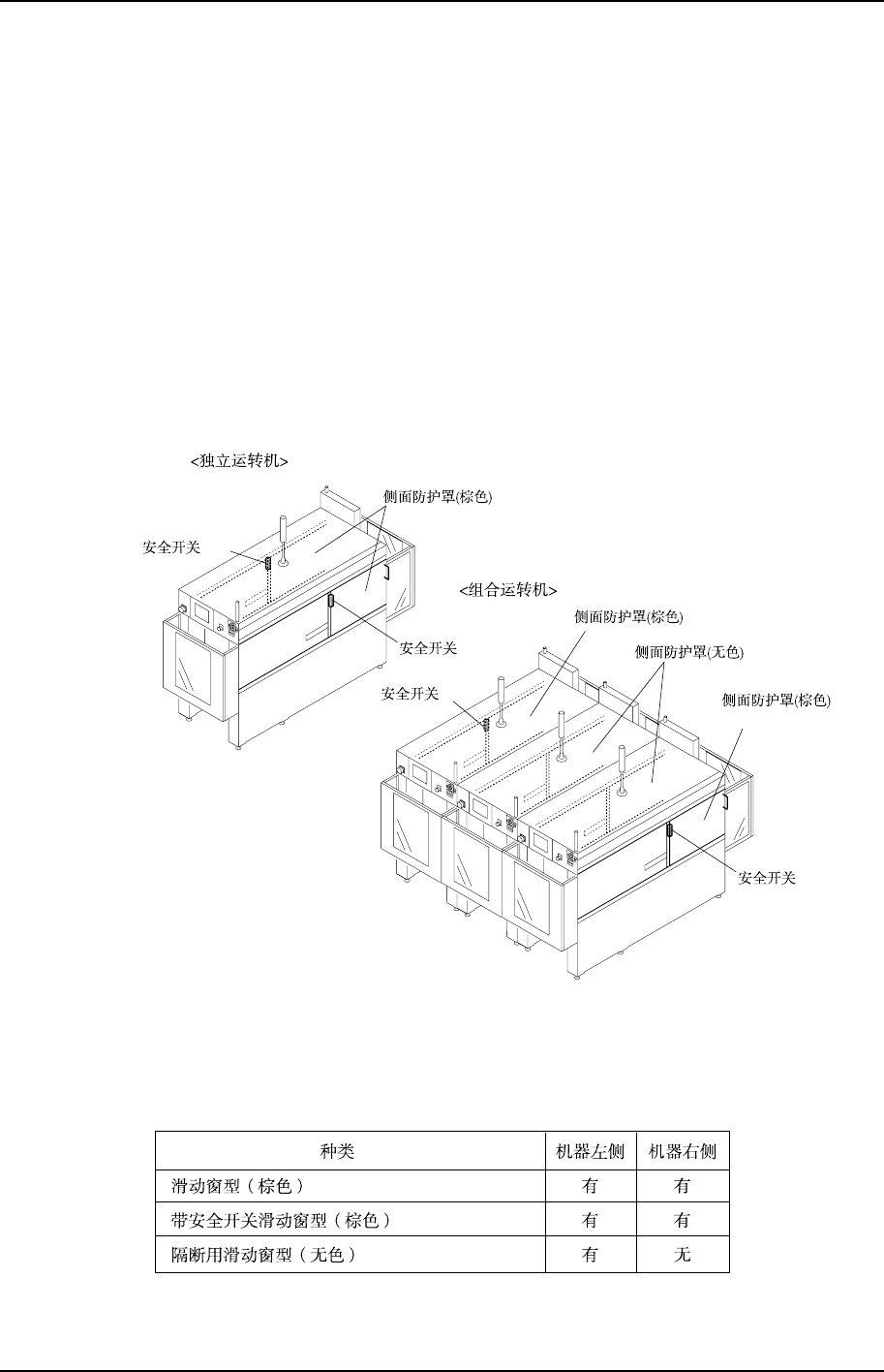 独立运转机器两侧面均设置了侧面防护罩(棕色)。组合运转机除了两侧面的防护罩外,还设