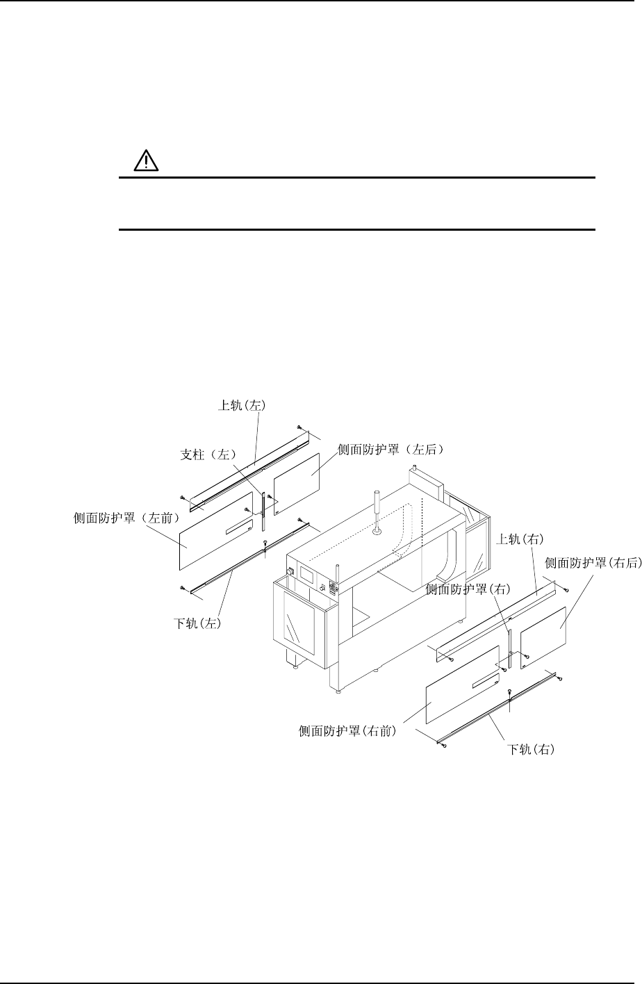 1. 拧下支柱上的固定侧面防护罩(前后)的螺丝,分别移动侧面防护罩并拆下。