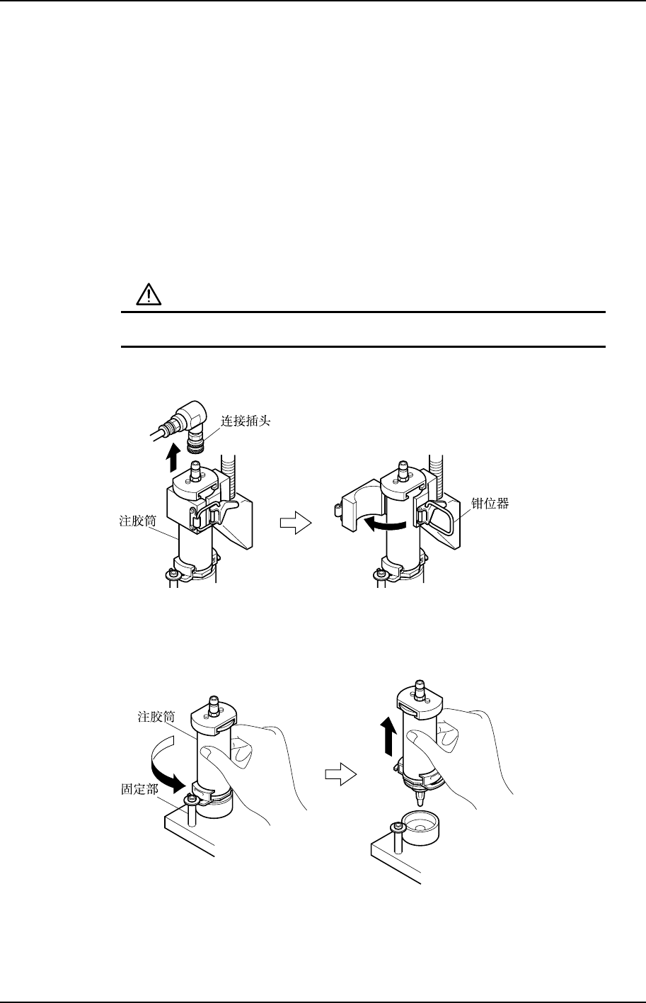 3. 反时针方向拧注胶筒约 45 度,从胶合置件头的固定部拆下注胶筒下部的固定架。在可