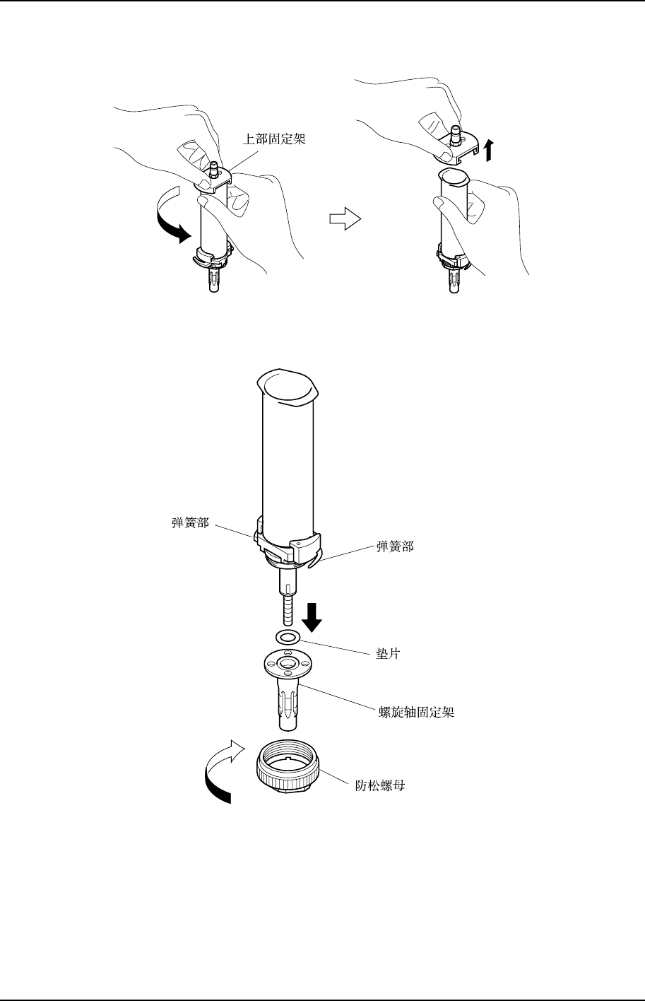 4. 一只手抓住注胶筒使之不转动,拧上部固定架约 90 度并拆下。