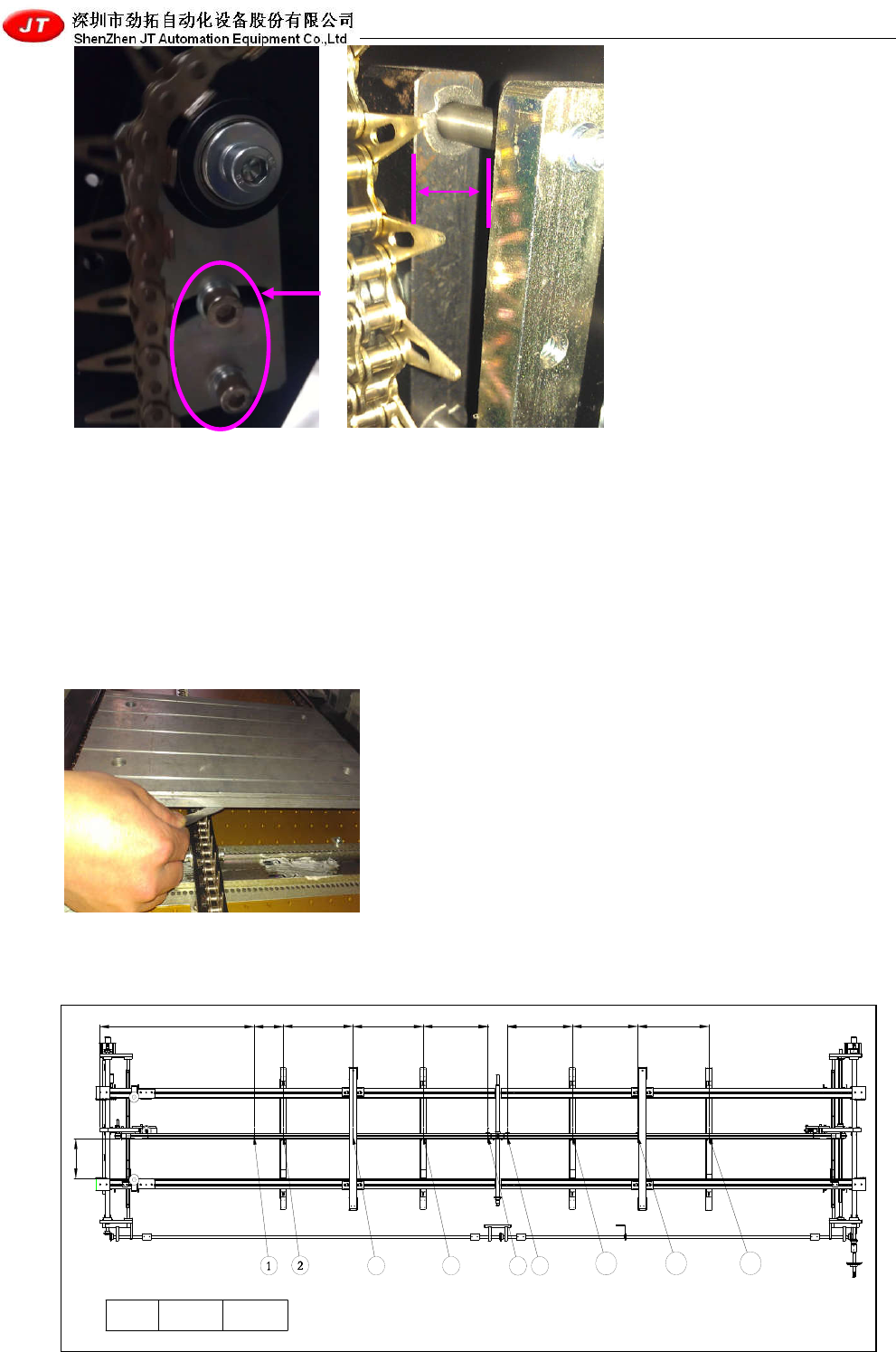 2)点检部位如下图所示,要求中支链条齿尖与运输链条销轴之间的间隙控制在 1±0.5mm(要求中支