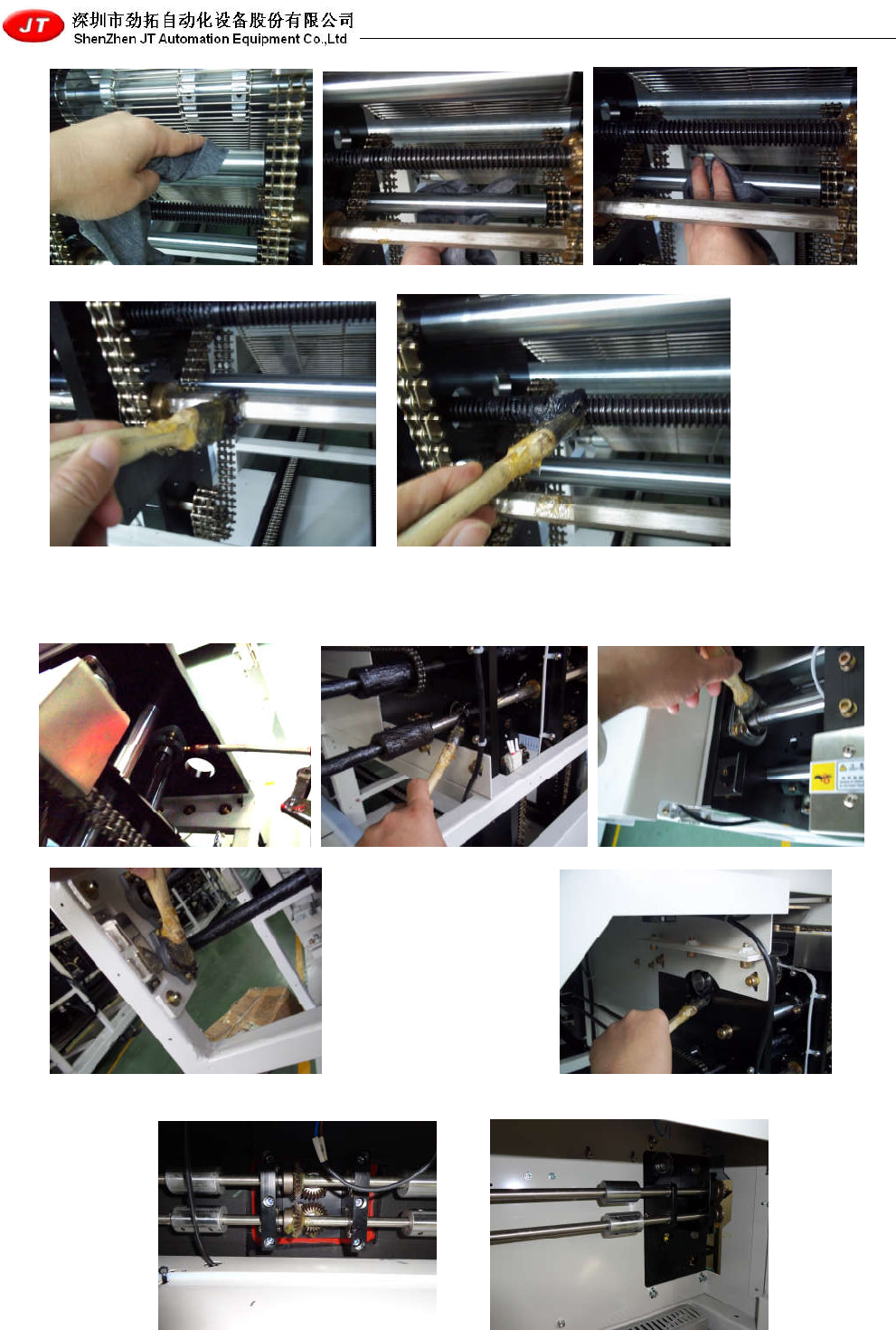 19 5)机头调宽丝杆与六方轴用刷子均匀刷润滑脂均匀涂抹 1 次/周; 6) 拔开万向轴承加油罩, 用油压枪加润滑脂 1 次/周, 无加油嘴轴承用油刷在轴承两边涂敷润 滑脂; 7)每月用油刷给导轨调宽窄传动杆锥型齿轮加普通润滑脂; 8) 检查弹簧状态和张紧齿轮状况 1 次/月, 检查紧固各齿轮螺丝是否松动, 在轴承上刷上高温 油;