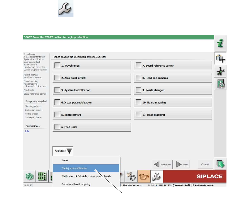 4 设置与调试 使用手册 SIPLACE SX1/SX2 V2 和 V3 版 4.6 调试贴片机 使用软件版本 SC.713.1 或更 新 版本 04/2020 212 4.6.1.1 执行初步校准 在工具栏中,点击 “ 维修工具 ”。 点击 自动校准 按钮。 4 图 4.6 - 1 维修工具 => 自动校准 选择 Selection (选择) = > Gantry axis c alibration (悬臂轴校…