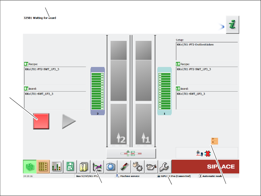 图 5.5 - 1 “ 生产 ” 视图中的用户界面组件 (图示以 SIPLACE SX 贴片机为例)