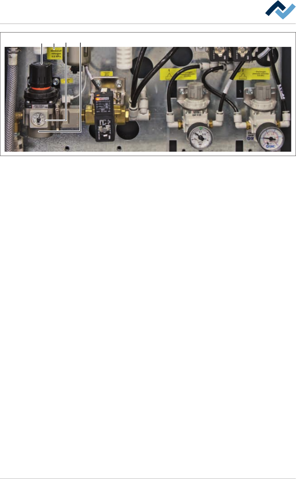 8|Service and maintenance 6 7 4 5 Fig.102: Adjusting the nitrogen input pressure ü Check and adjust the nitrogen input pressure a) Visual inspection of the pressure reducer (4) b) Read the current pressure on the pres…